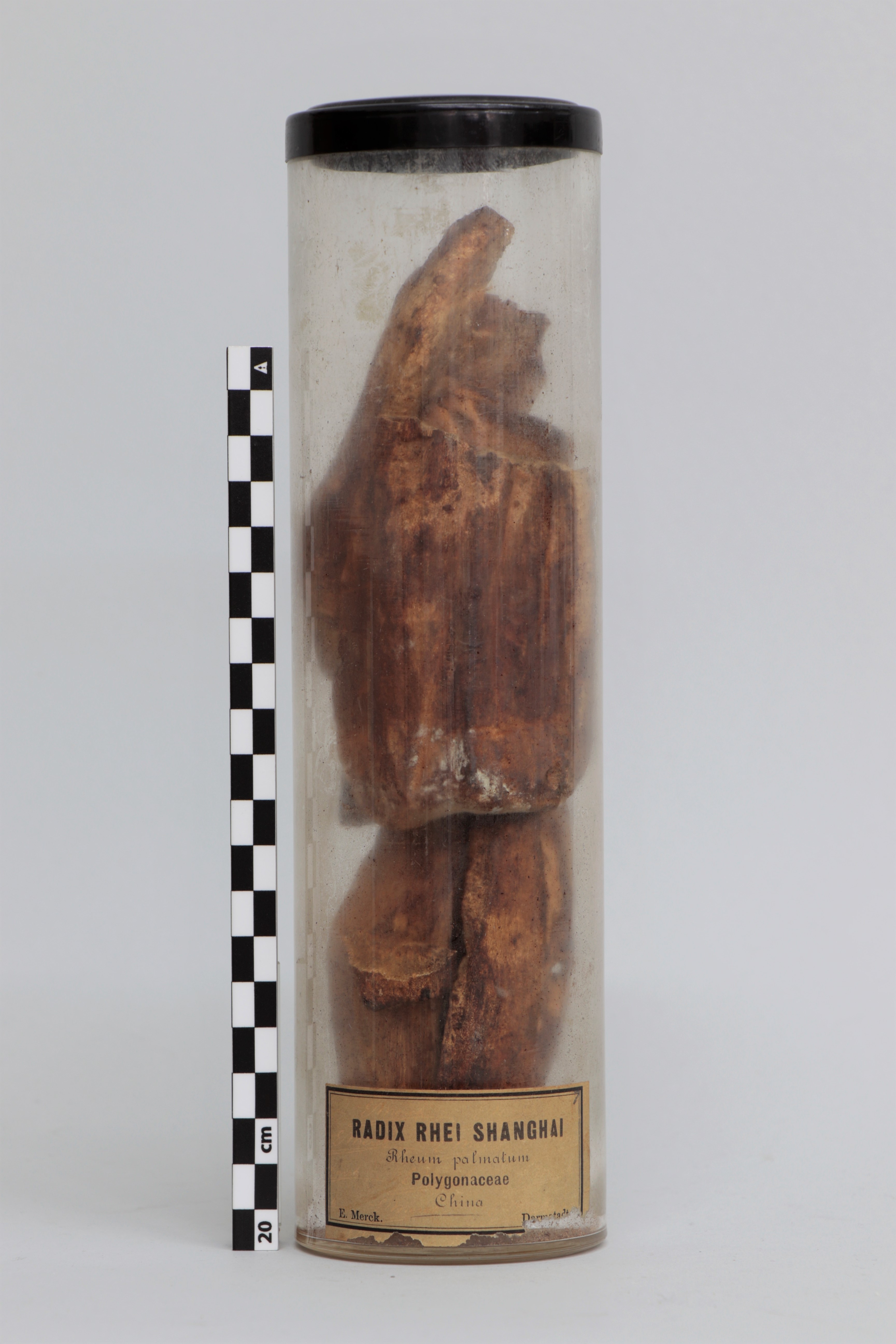 Bote de vidrio cilíndrico que contiene raíces del género Rheum perteneciente a la familia Polygonaceae con origen en Shanghai, China. En el exterior del bote lleva adherida una etiqueta rectangular de papel escrita a máquina, donde se contempla el nombre de la sustancia contenida, su lugar de origen y la empresa que lo ha fabricado (E. Merck con sede en Darmstadt, Alemania). La tapa del bote es de un plástico rígido de color negro.