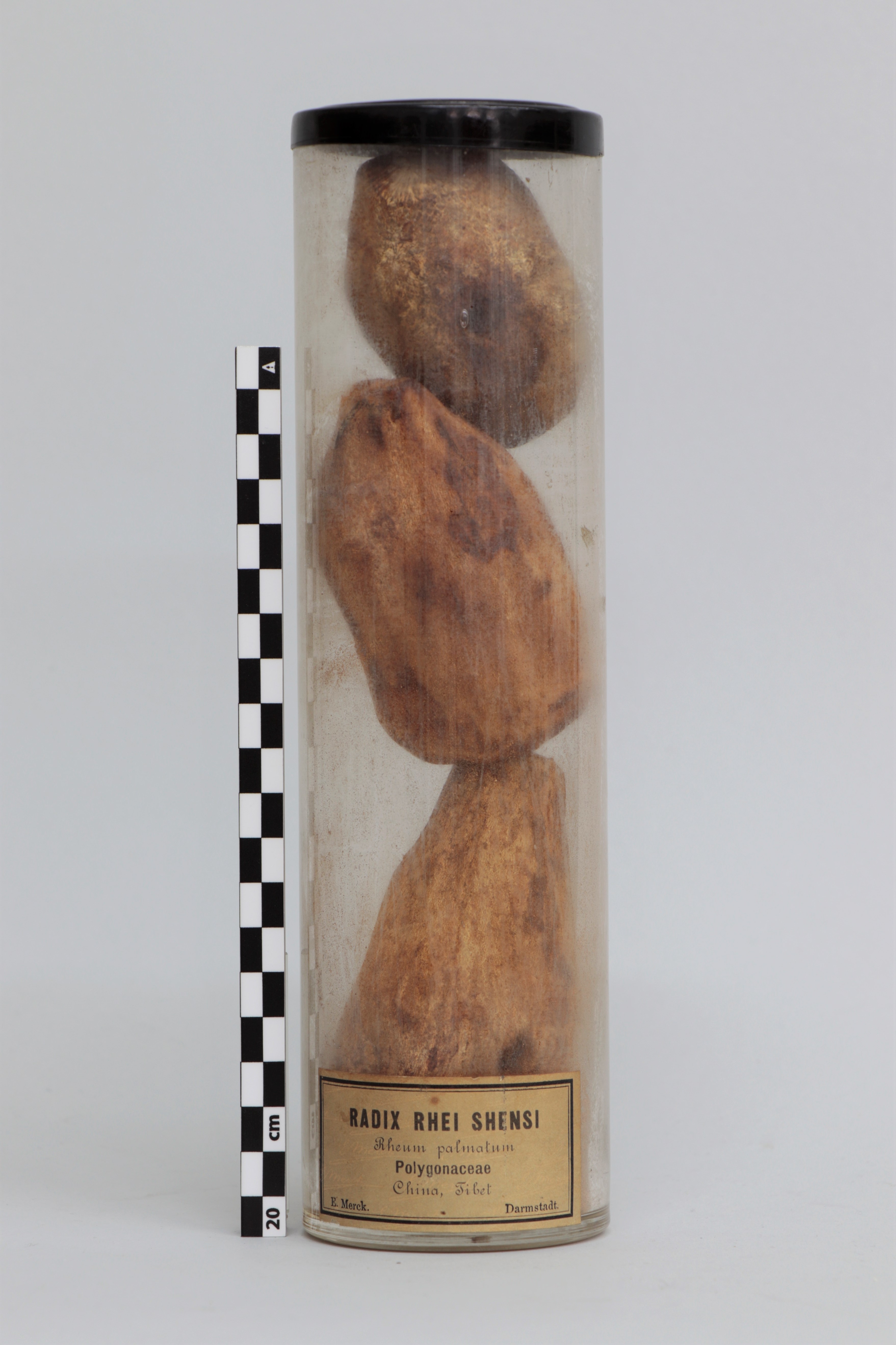 Bote de vidrio cilíndrico que contiene raíces del género Rheum perteneciente a la familia Polygonaceae con origen en Shaanxi, China. En el exterior del bote lleva adherida una etiqueta rectangular de papel escrita a máquina, donde se contempla el nombre de la sustancia contenida, su lugar de origen y la empresa que lo ha fabricado (E. Merck con sede en Darmstadt, Alemania). La tapa del bote es de un plástico rígido de color negro.
