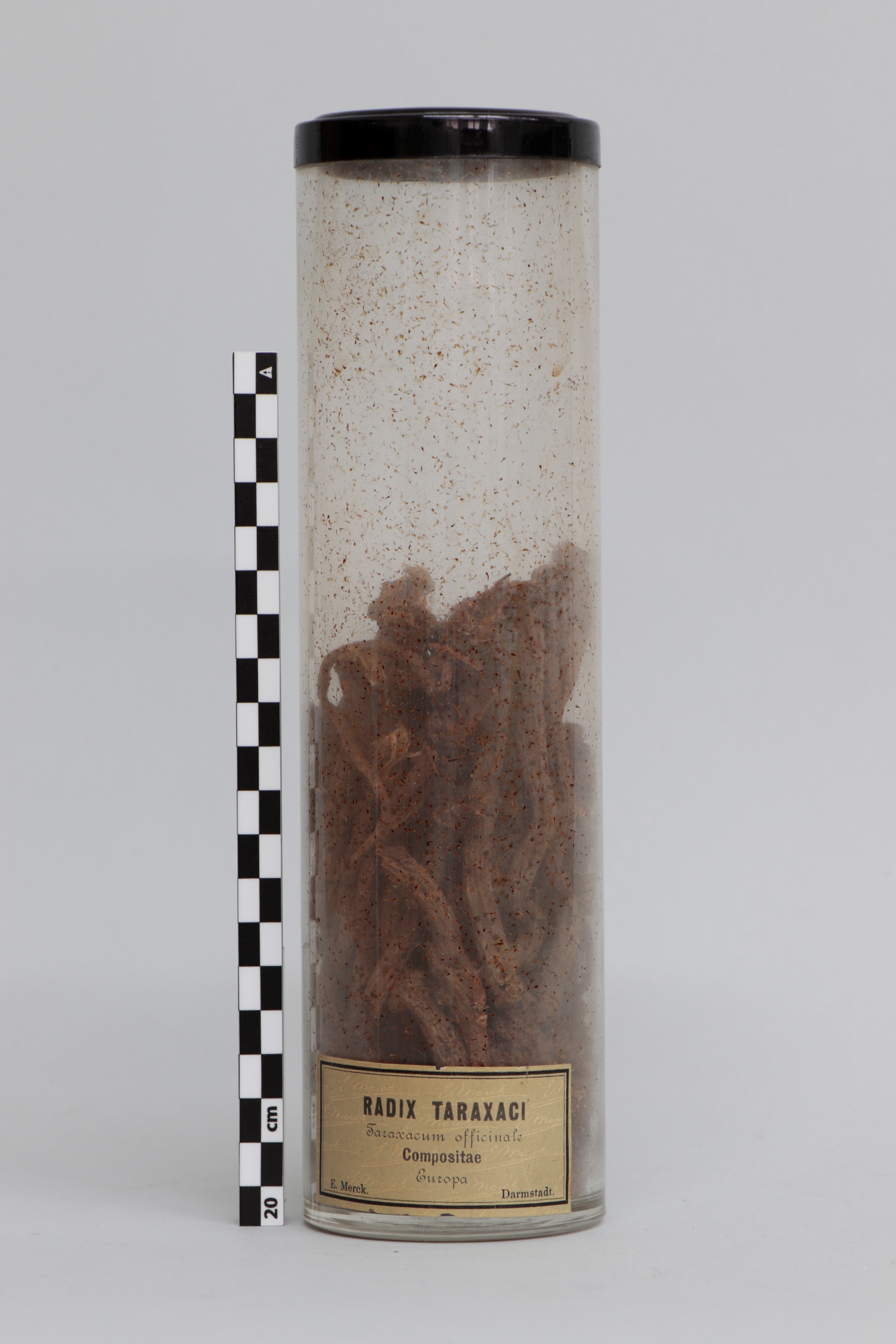Bote de vidrio cilíndrico que contiene raíces de Taraxacum officinale, conocido comúnmente como diente de león. En el exterior del bote, lleva adherida una etiqueta rectangular de papel escrita a máquina, donde se contempla el nombre de la sustancia contenida, su lugar de origen y la empresa que lo ha fabricado (E. Merck con sede en Darmstadt, Alemania). La tapa del bote es de un plástico rígido de color negro.