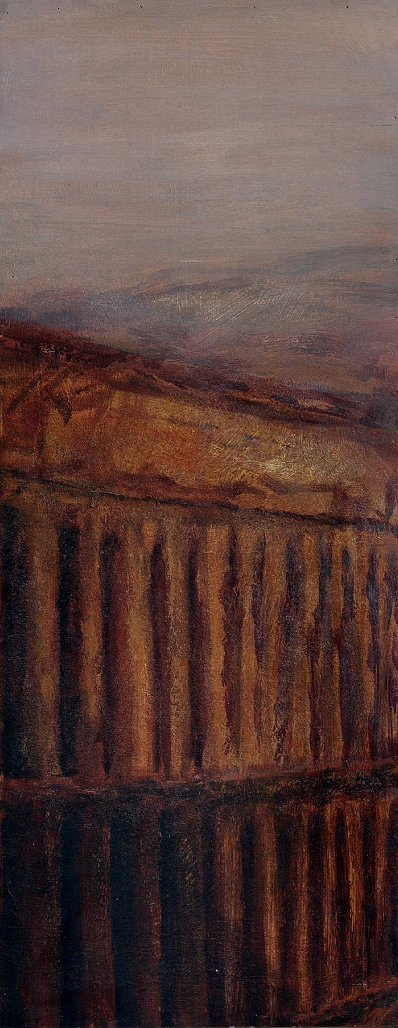 En el campo inferior, una serie de estructuras longitudinales, como de columnas alineadas, se plasman a partir de una paleta cromática de ocres dorados velados por negros azulados y violáceos mientras que, en el plano superior a éste, el tono de los anaranjados es más luminoso y brillante, rematado por una estructura horizontal que introduce el paisaje, en grises azulados a los que se imprimen pinceladas cálidas.
