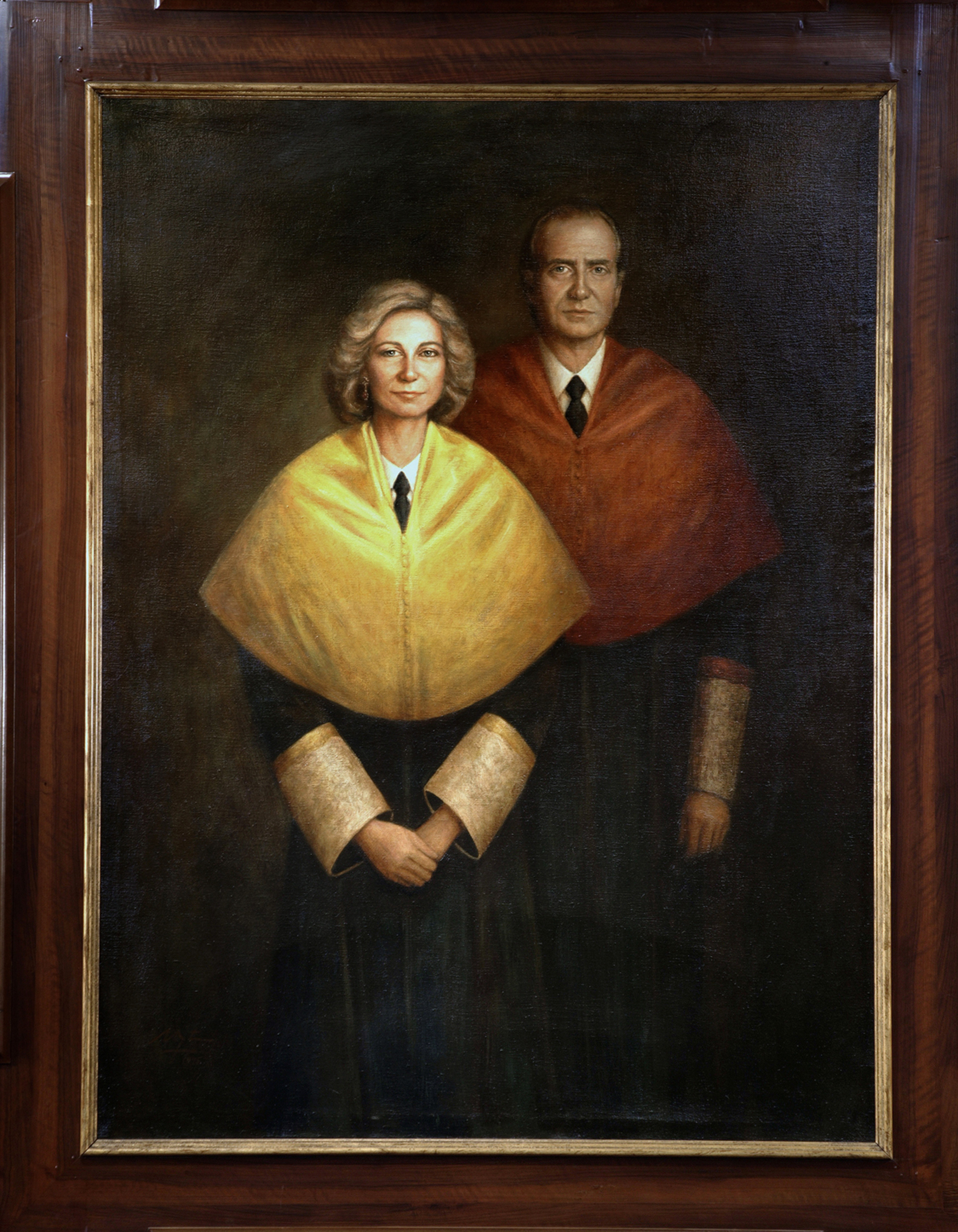 Retrato de los Reyes de España sobre fondo neutro oscuro, de pie con el cuerpo y cabeza de frente. Doña Sofía se encuentra en primer plano con la mano derecha superpuesta sobre la otra y Don Juan Carlos I, a su izquierda en segundo plano, con los brazos pegados al cuerpo.