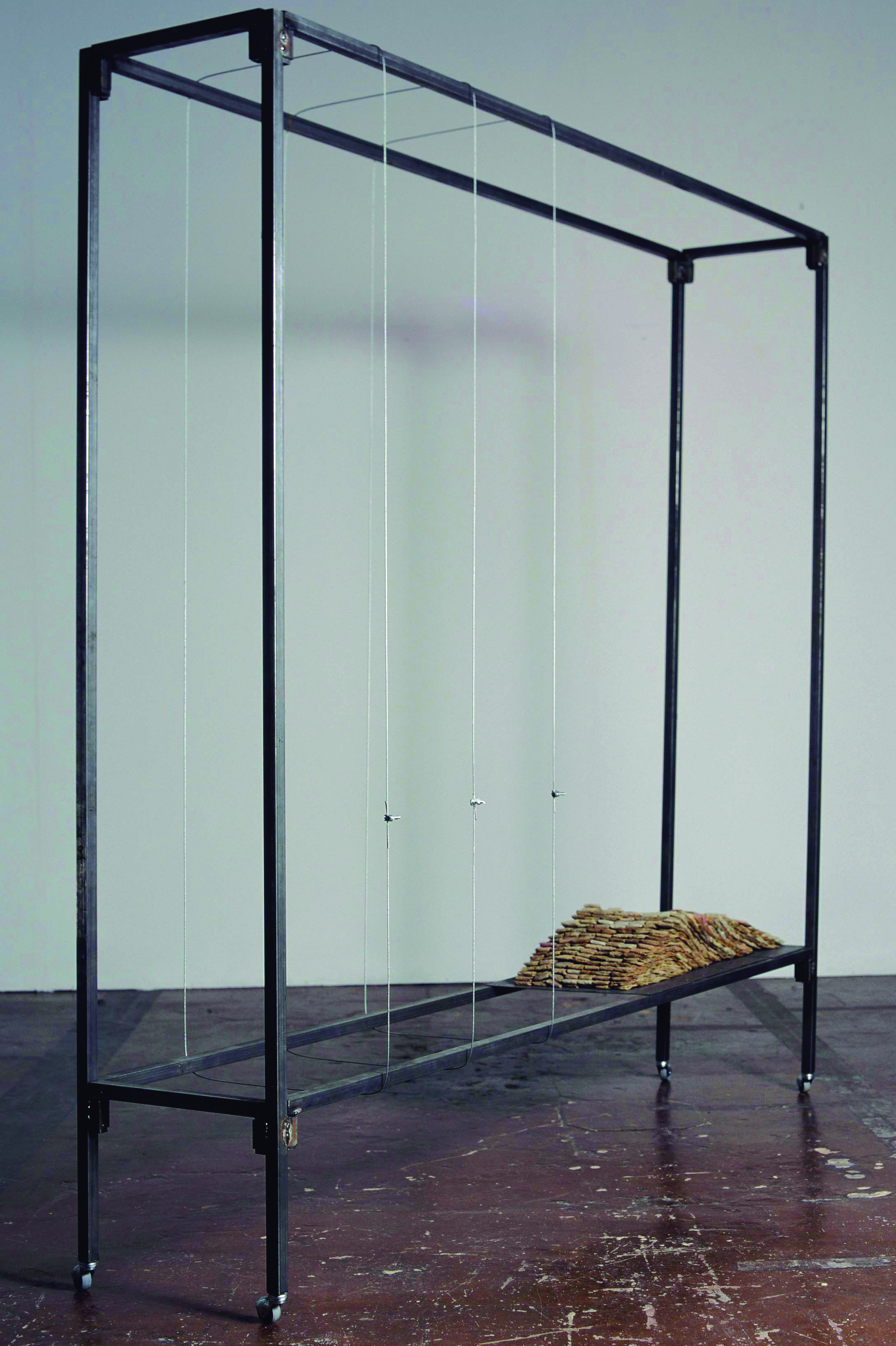 Estructura metálica paralelepípida de área rectangular, creada a partir de tubo de hierro de sección cuadrangular, en la que se tensan tres líneas de cable de acero. Sobre la base, sobreelevada mediante el uso de cuatro patas del mismo material metálico, se superponen una serie de hojas hechas mediante la unión de bolsas de té usadas.