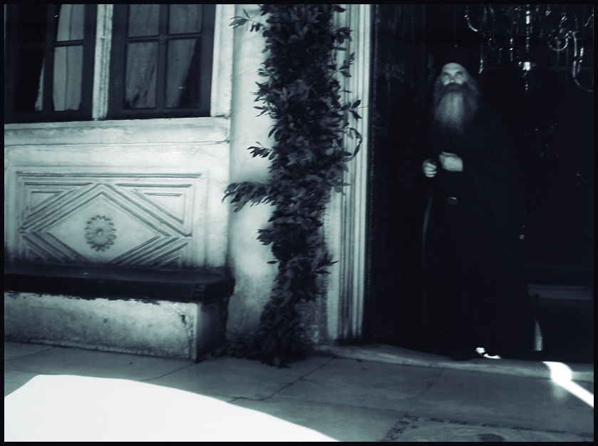 La fotografía nos muestra a un monje con el atuendo negro correspondiente a la Iglesia ortodoxa oriental saliendo del Oficio.
