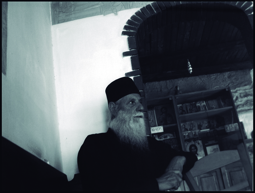 La fotografía, en blanco y negro, nos muestra a un monje anciano, con barba blanca y con la indumentaria tradicional perteneciente a la Iglesia ortodoxa oriental. Aparece sentado, apoyado en el respaldo de una silla. Al fondo se aprecia un mueble que contiene diversos iconos.