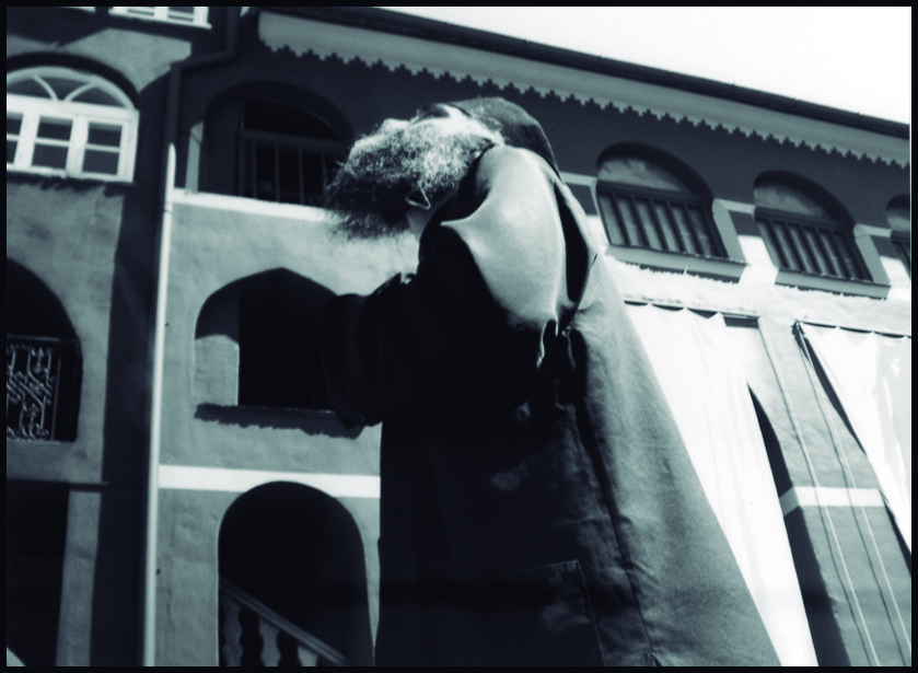 Fotografía en plano contrapicado de un monje ortodoxo con su hábito mientras parece dar un paseo por la zona, apreciando tras él la arquitectura del lugar.
