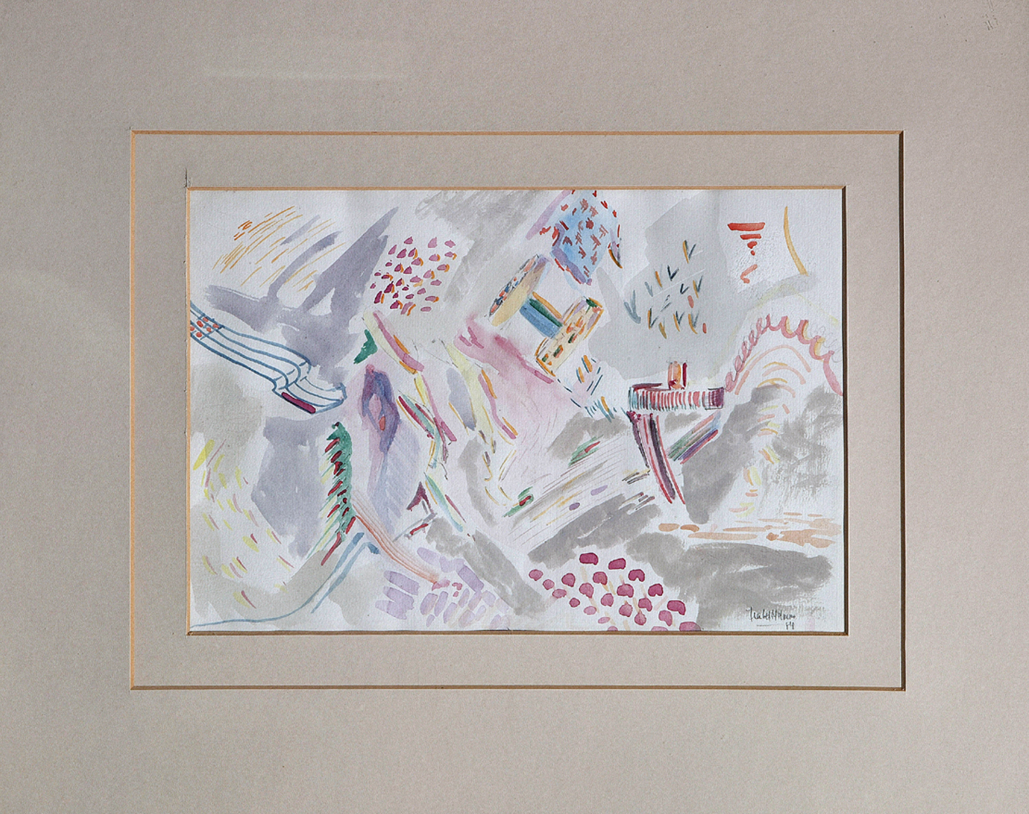 Acuarela en la que de forma muy sintética se describe un paisaje en el que vemos árboles, plantas, montañas, ruedas que pueden recordar máquinas agrícolas, todo ello muy esquematizado.