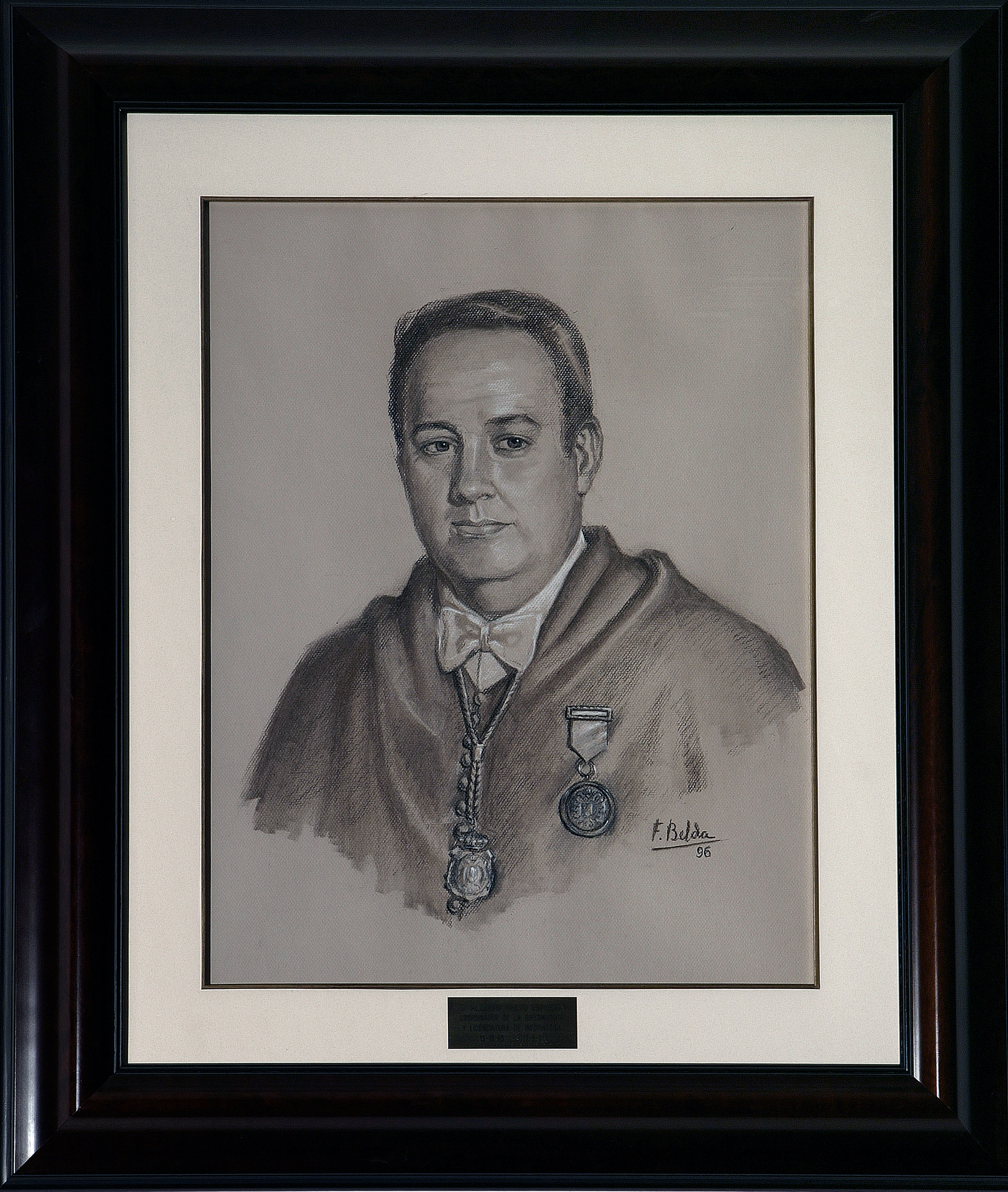 Retrato masculino de busto levemente girado a la izquierda. El retratado no dirige la mirada al espectador y viste traje académico con pajarita y camisa blanca. Sobre su pecho luce la medalla de catedrático con cordón y la de 25 años de servicio en la Universidad de Granada.