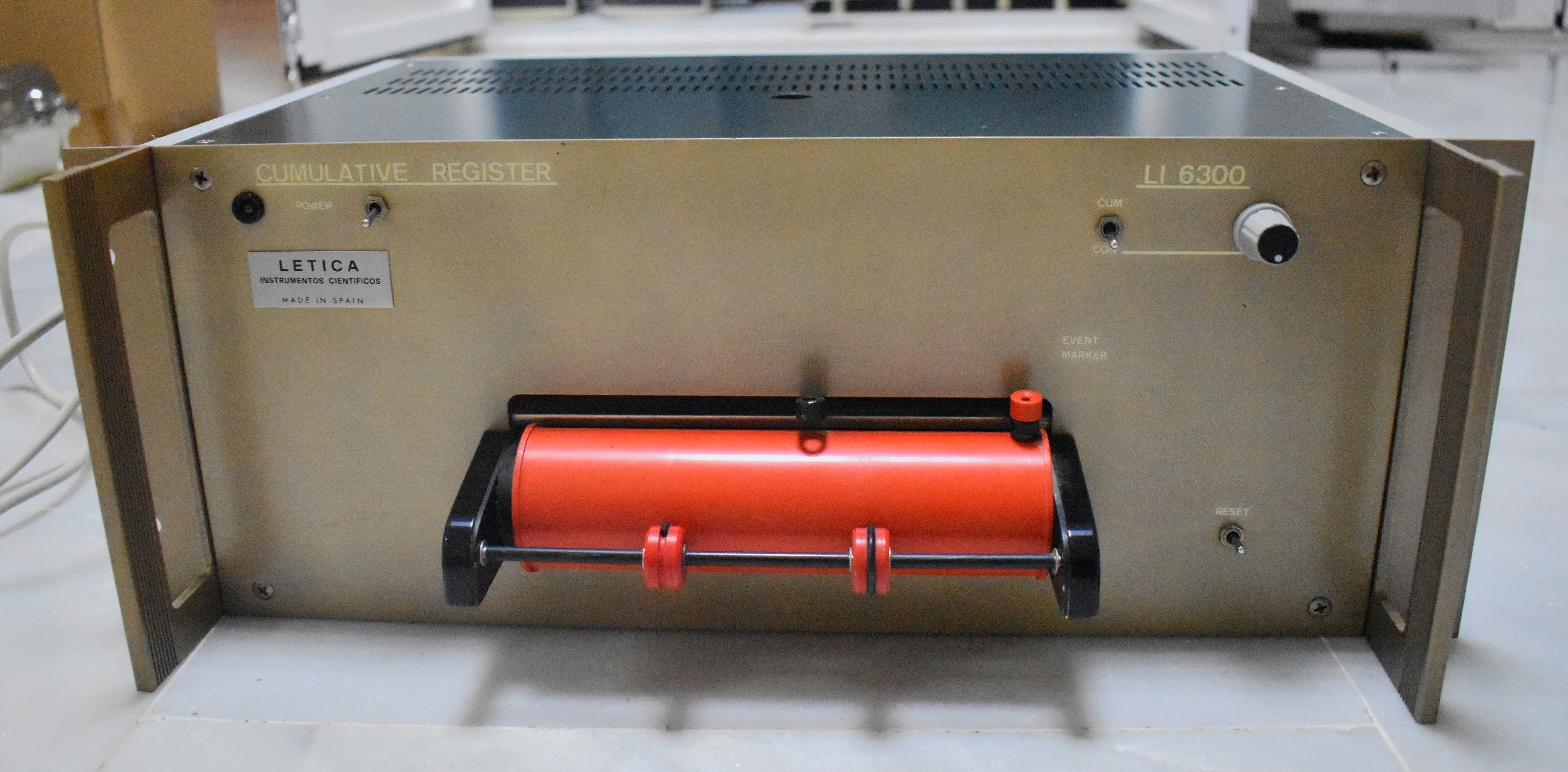Otra particularidad del LI 6300 es que se puede hacer que el carro acumulativo avance con una velocidad constante regulable mediante un mando frontal. Este avance puede interrumpirse en cualquier momento suministrando una señal a los contactos posteriores. Esto lo hace idóneo para utilizarlo para el registro de latencias (Jaulas de Evitación y Escape, etc.).