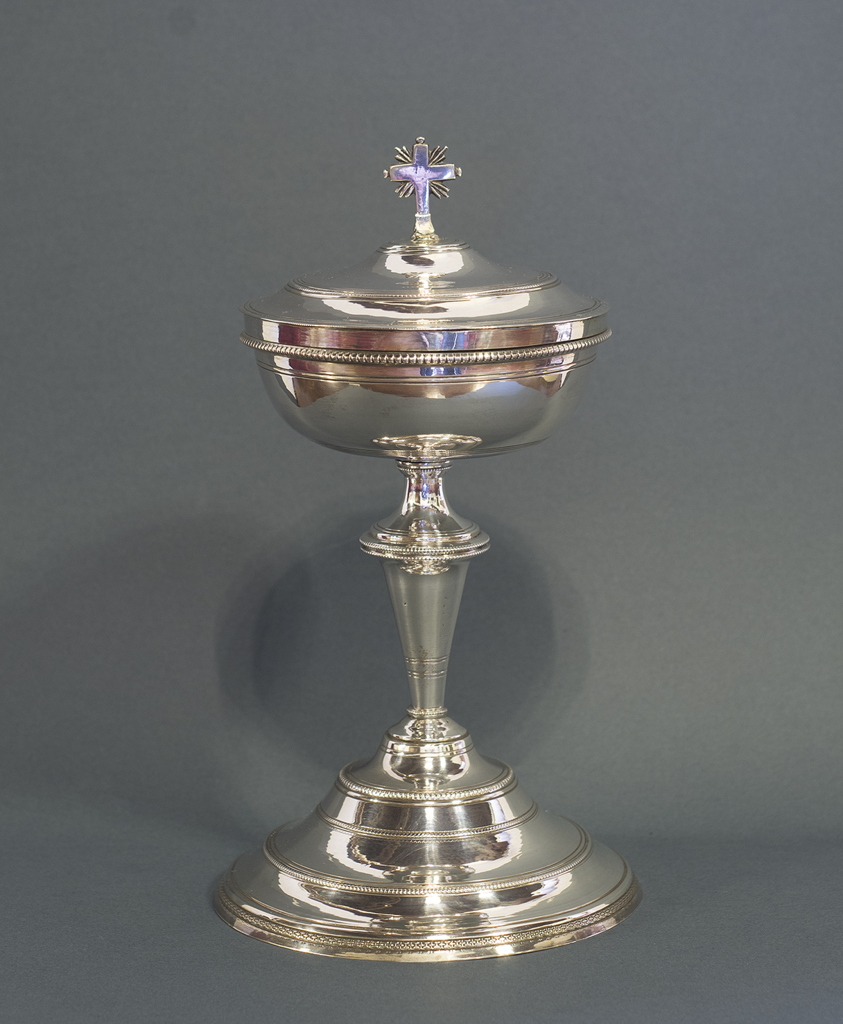 Copón con tapadera unida por un gozne y rematada por una cruz para contener las sagradas formas. En un ensanchamiento del astil hay una filigrana de bolitas. En la base hay dos grecas en resalte.