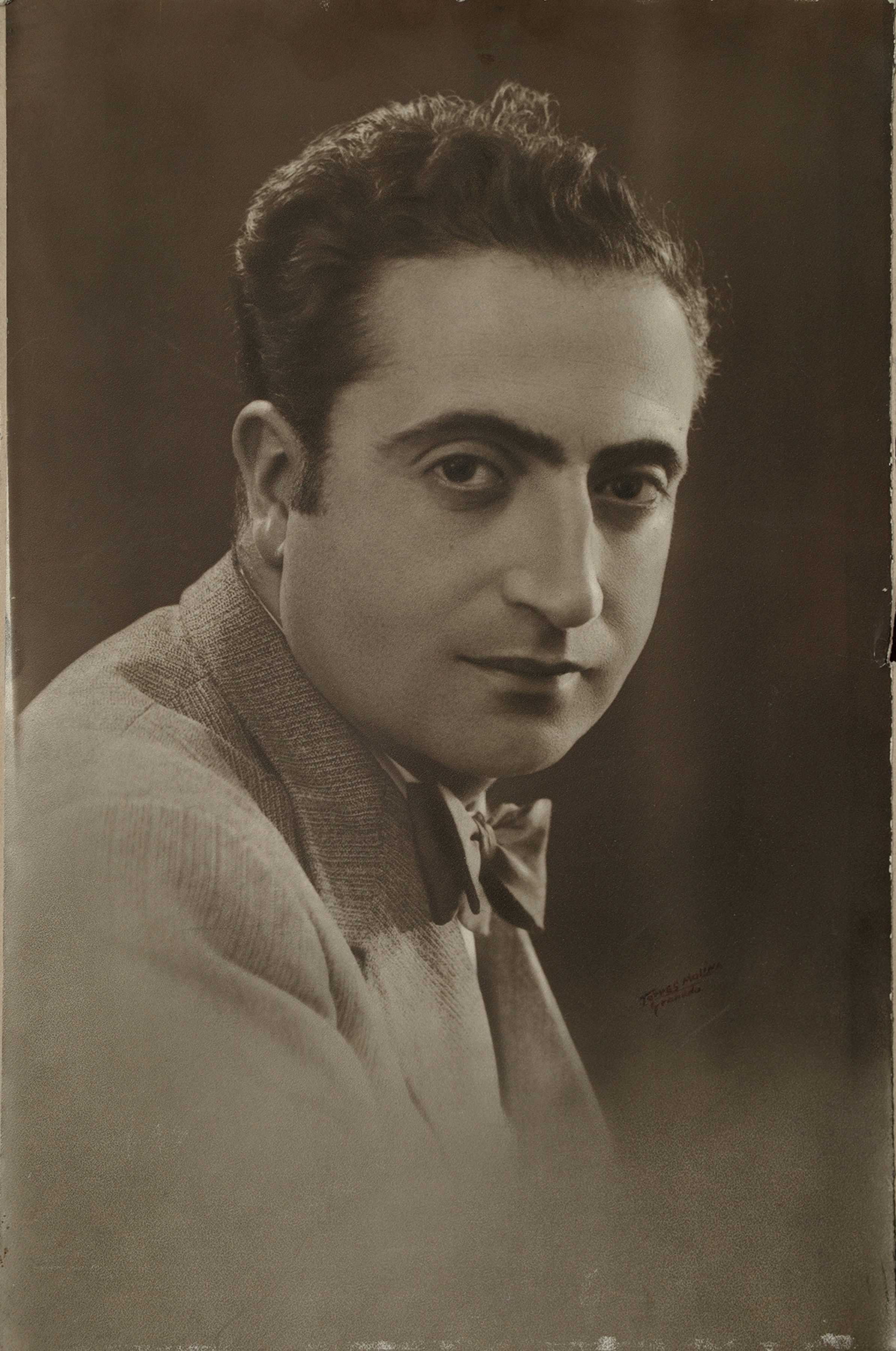 Retrato fotográfico en blanco y negro de tres cuartos en plano medio corto de hombre de mediana edad girado hacia la derecha con mirada al espectador, pelo ondulado y vestido con traje y pajarita oscura. No presenta marco.
