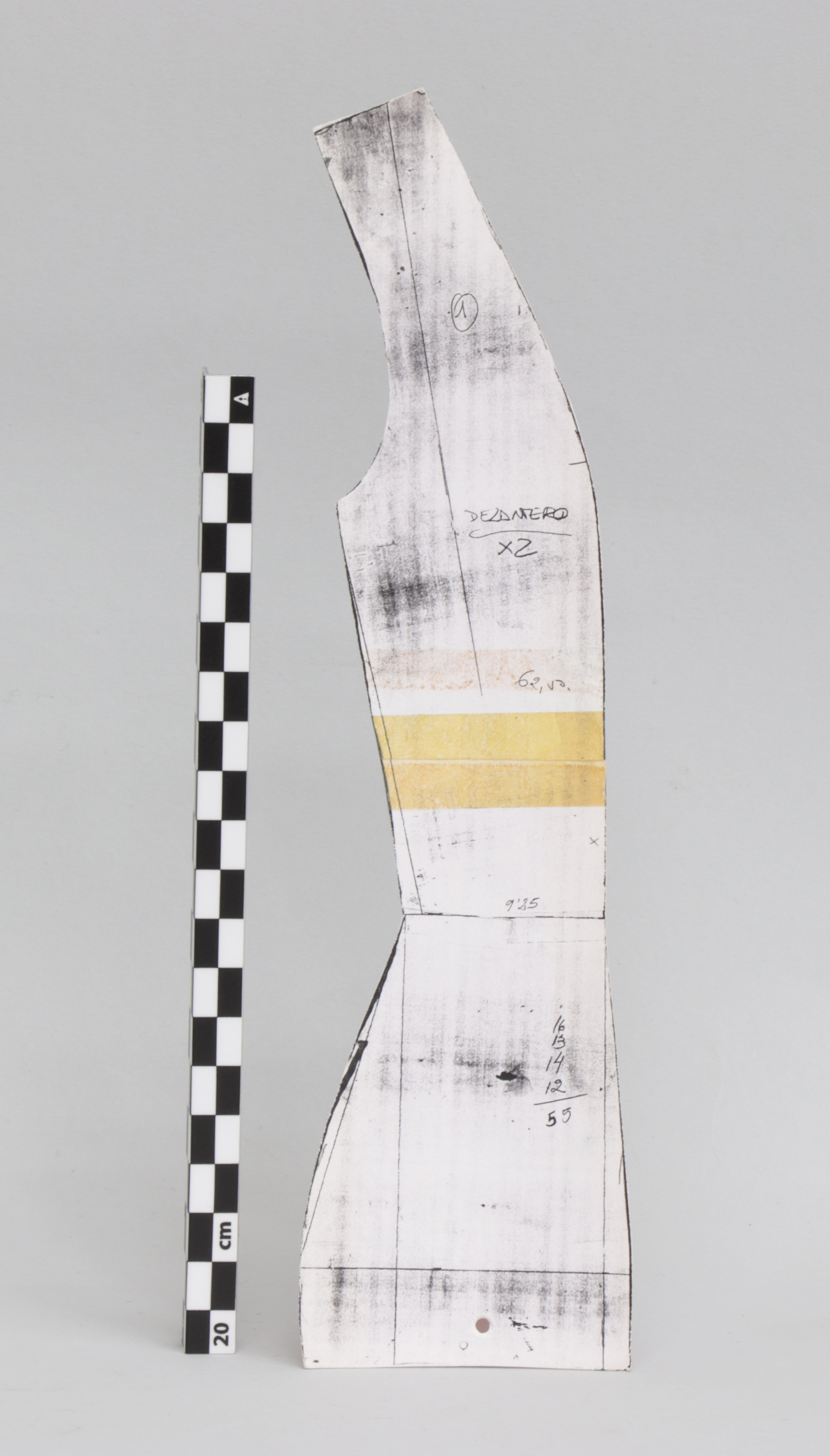 Está realizado en papel (es una fotocopia probablemente del original) pegado sobre una cartulina y recortado. Los cuatro patrones que forman el vestido 1 están unidos por un hilo bramante.