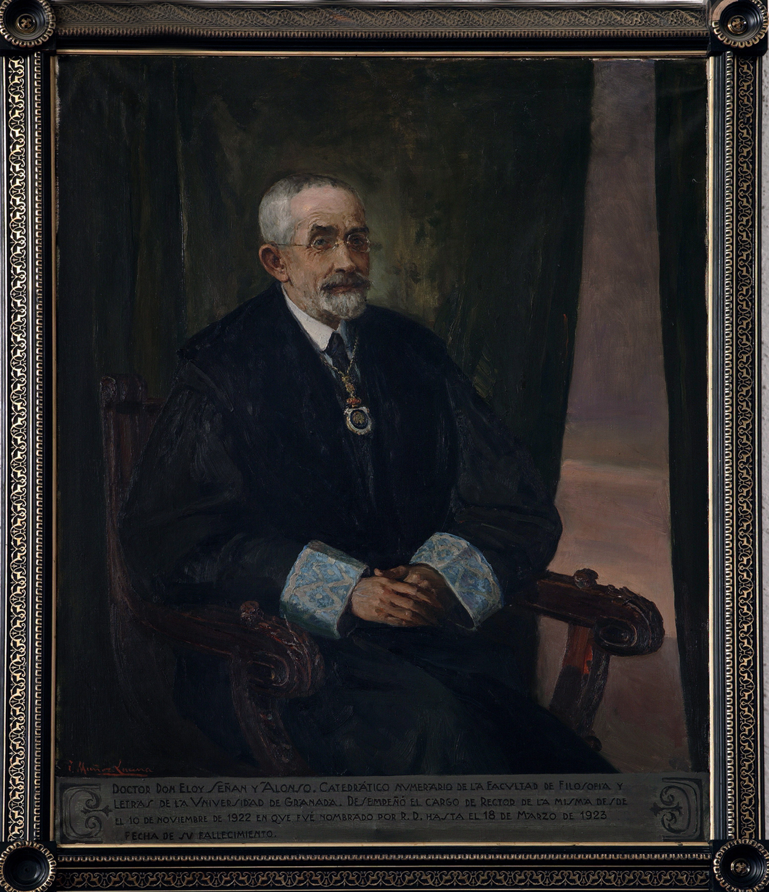 La obra está firmada en el ángulo inferior izquierdo en rojo: "T. Muñoz Lucena". Además, en la parte inferior del cuadro reza el siguiente rótulo: "DOCTOR D. ELOY SEÑAN ALONSO, CATEDRÁTICO NUMERÁRIO DE LA FACULTAD DE FILOSOFÍA Y / LETRAS DE LA UNIVERSIDAD DE GRANADA. DESEMPEÑÓ EL CARGO DE RECTOR DE LA MISMA DESDE / EL 10 DE NOVIEMBRE DE 1922, EN QUE FUÉ NOMBRADO POR R. D. HASTA EL 18 DE MARZO DE 1923 / FECHA DE SU FALLECIMIENTO".