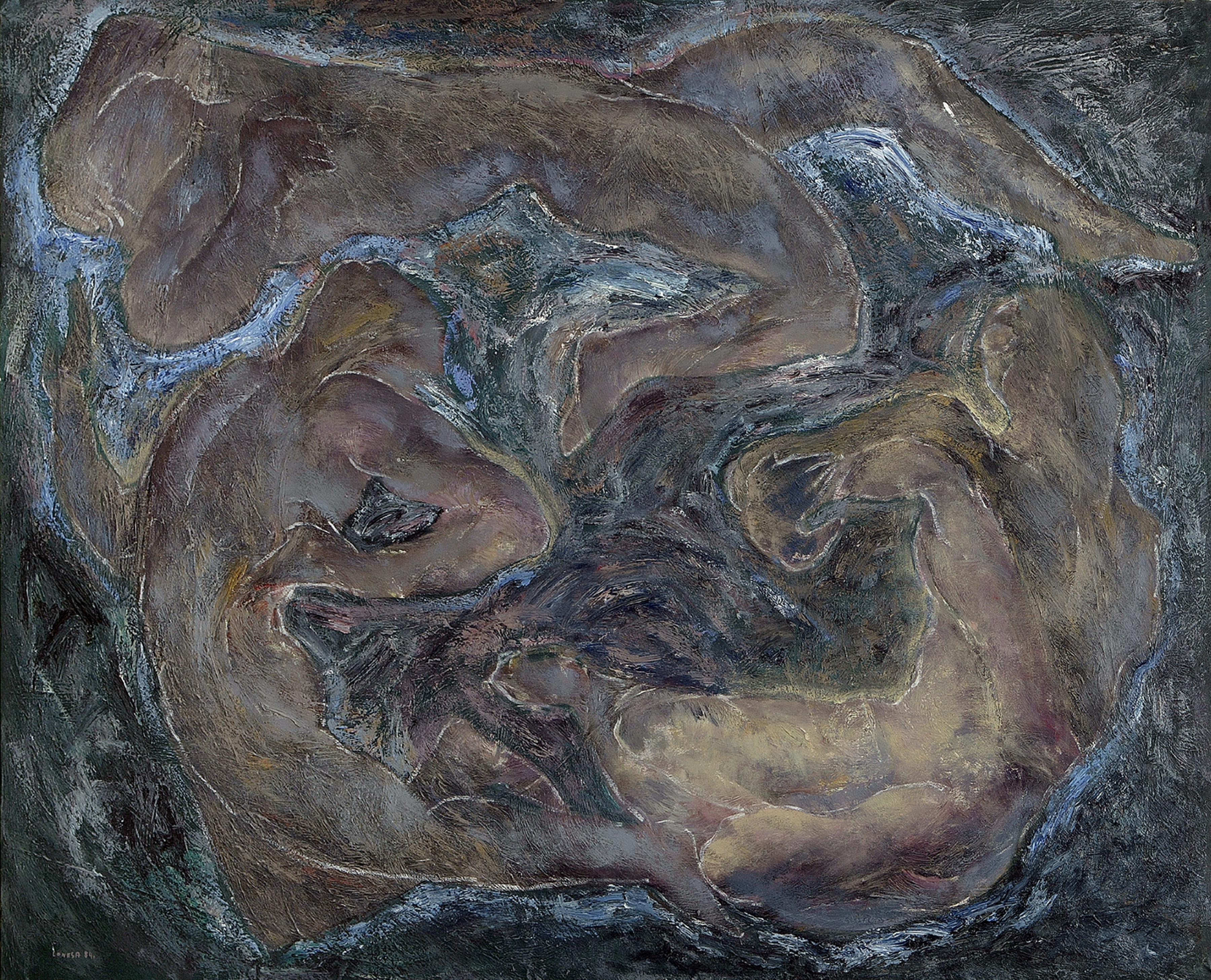 Composición de agitado discurso de Paco Conesa, característica de su obra de principios de los años ochenta. En un desenfrenado barroquismo, tres cuerpos desnudos, aparentemente asexuados, se retuercen conformando un cerrado círculo de figuras autónomas. Sin mayor detalle que la propia configuración plástica de las figuras, el color, predominantemente verde y ocre matizados, ayuda a crear la sensual danza plena de ingravidez. El idealismo y la abstracción figurativa de Conesa están aquí muy presentes, en una obra donde los cuerpos invaden todo el espacio físico del cuadro, intentando desesperadamente escapar de su encierro.
