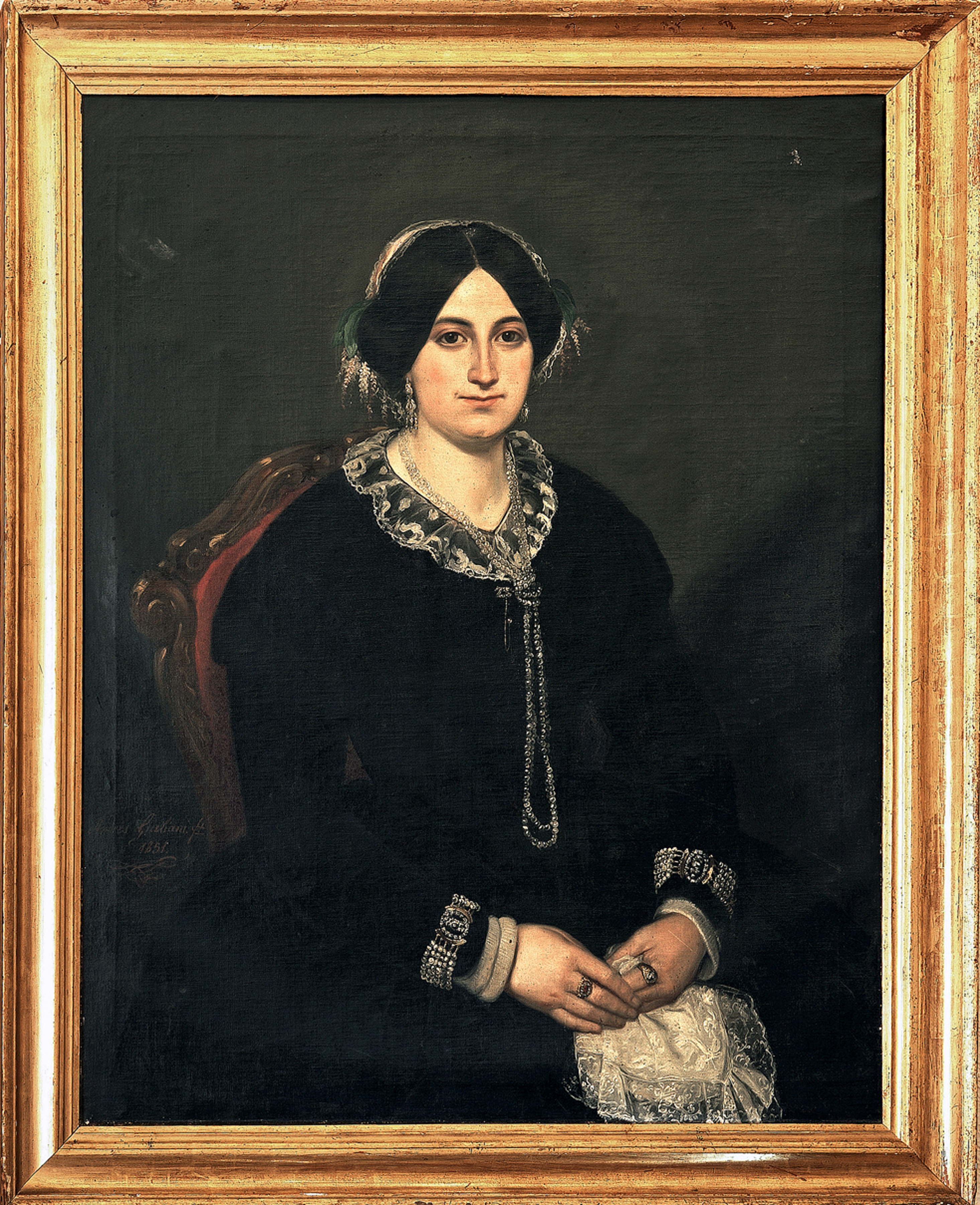 La mujer aparece sentada en posición frontal ligeramente girada hacia la derecha sobre sillón dorado tapizado en rojo. Viste traje negro con cuello de encaje y cabello recogido con tocado; luce pendientes, largo collar de cuentas anudado a la altura del escote del vestido, pulseras y anillos en ambas manos. Sostiene un pañuelo blanco bordado y con encajes que el artista recrea con gran precisión y detalle.