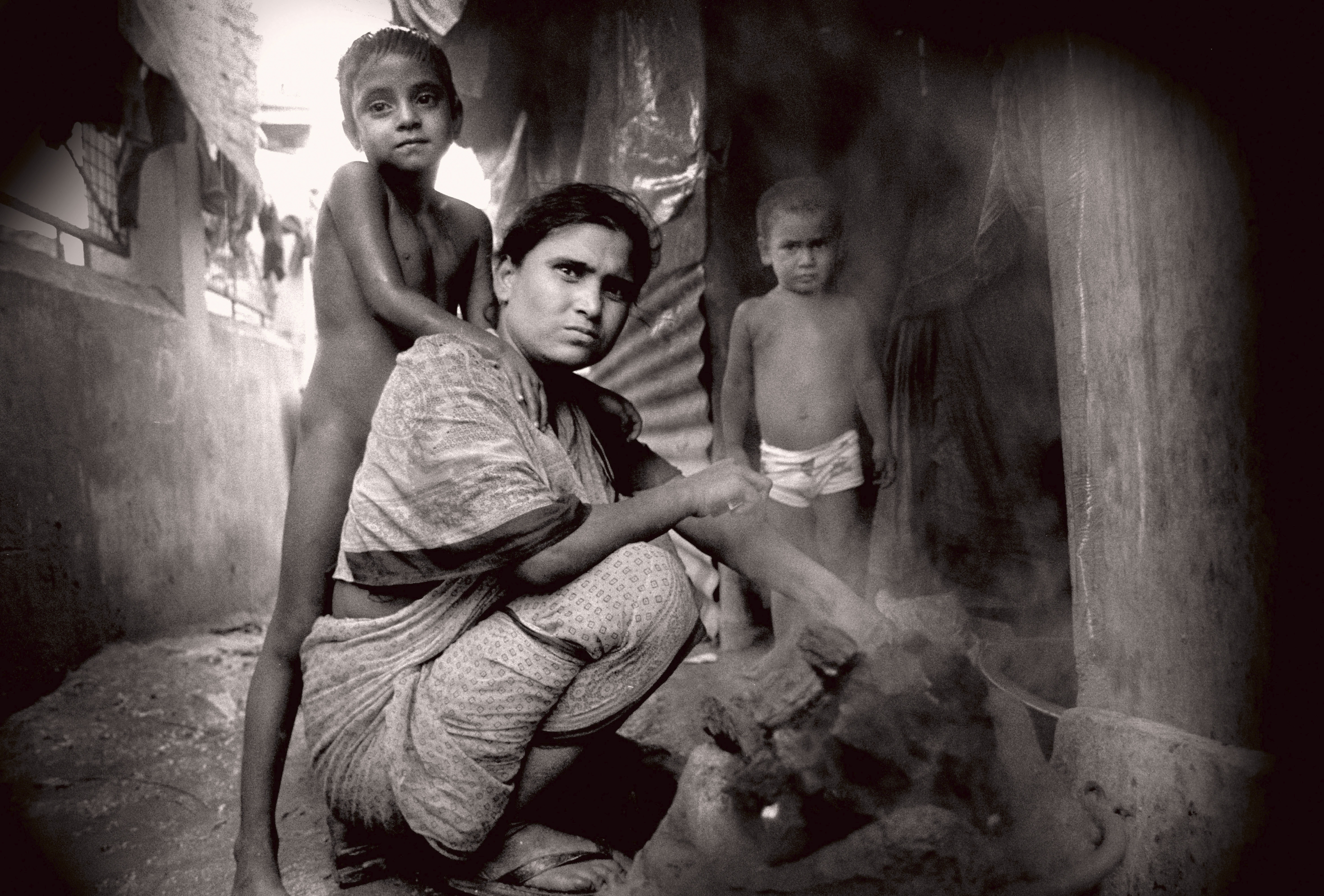 Fotografía en blanco y negro, realizada desde un punto de vista bajo, de tres personas en un espacio urbano abierto. La calle contextualiza la escena, enmarcando a los protagonistas con muros desnudos de edificios humildes de cuyas ventanas pende ropa tendida y que se rematan en los bajos con chapa ondulante y plásticos.