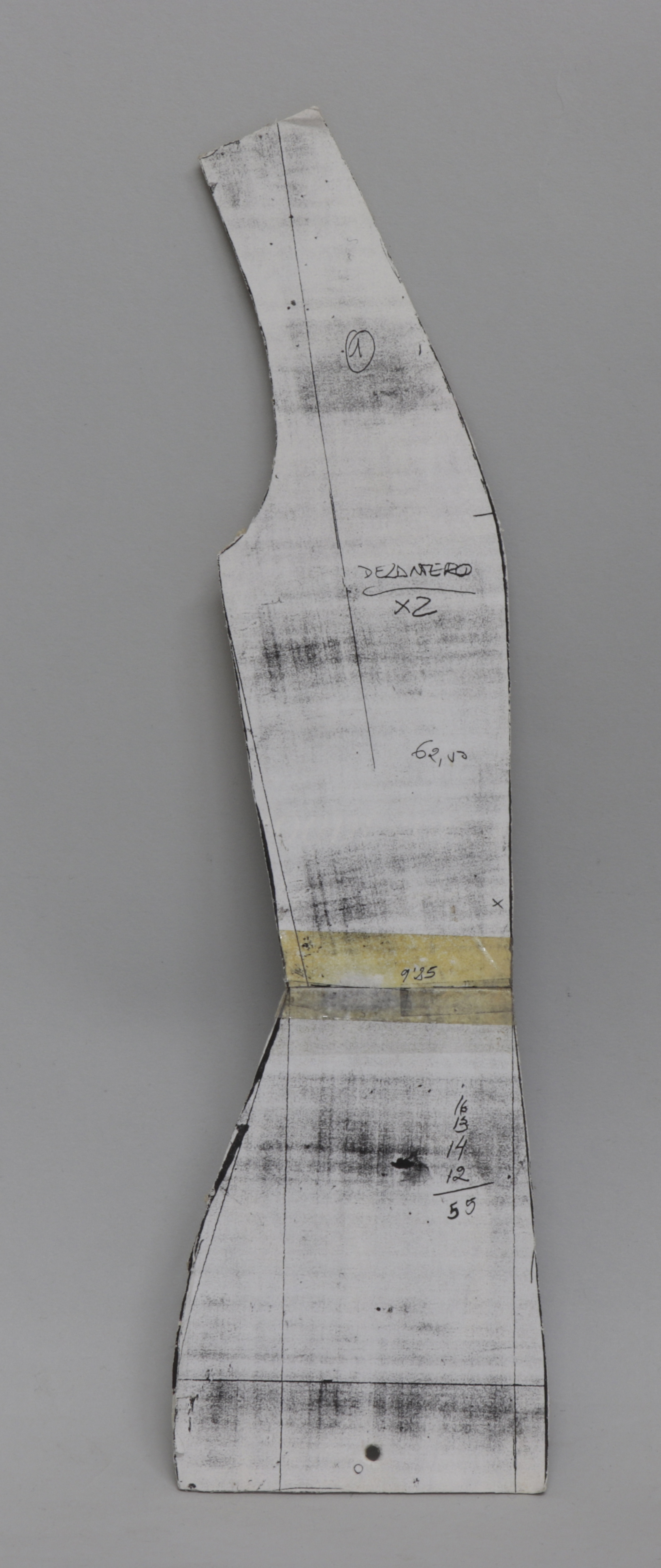 Está realizado en papel (es una fotocopia probablemente del original) pegado sobre un cartón y recortado. Los cuatro patrones que forman el vestido 2 están unidos por un hilo bramante.