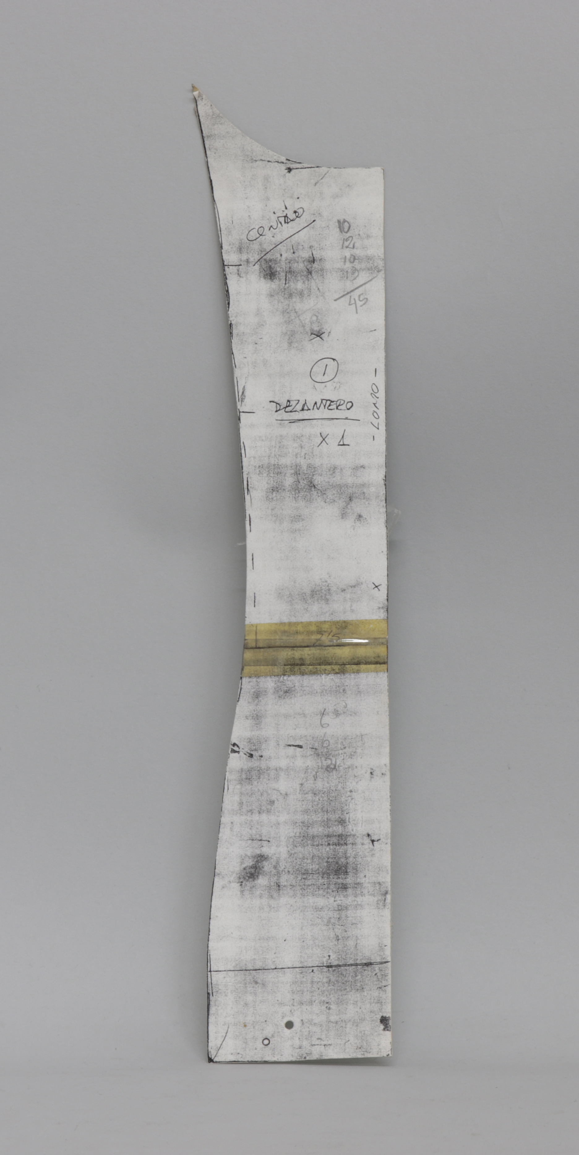 Está realizado en papel (es una fotocopia probablemente del original) pegado sobre una cartulina y recortado. Los cuatro patrones que forman el vestido 3 están unidos por un hilo bramante.