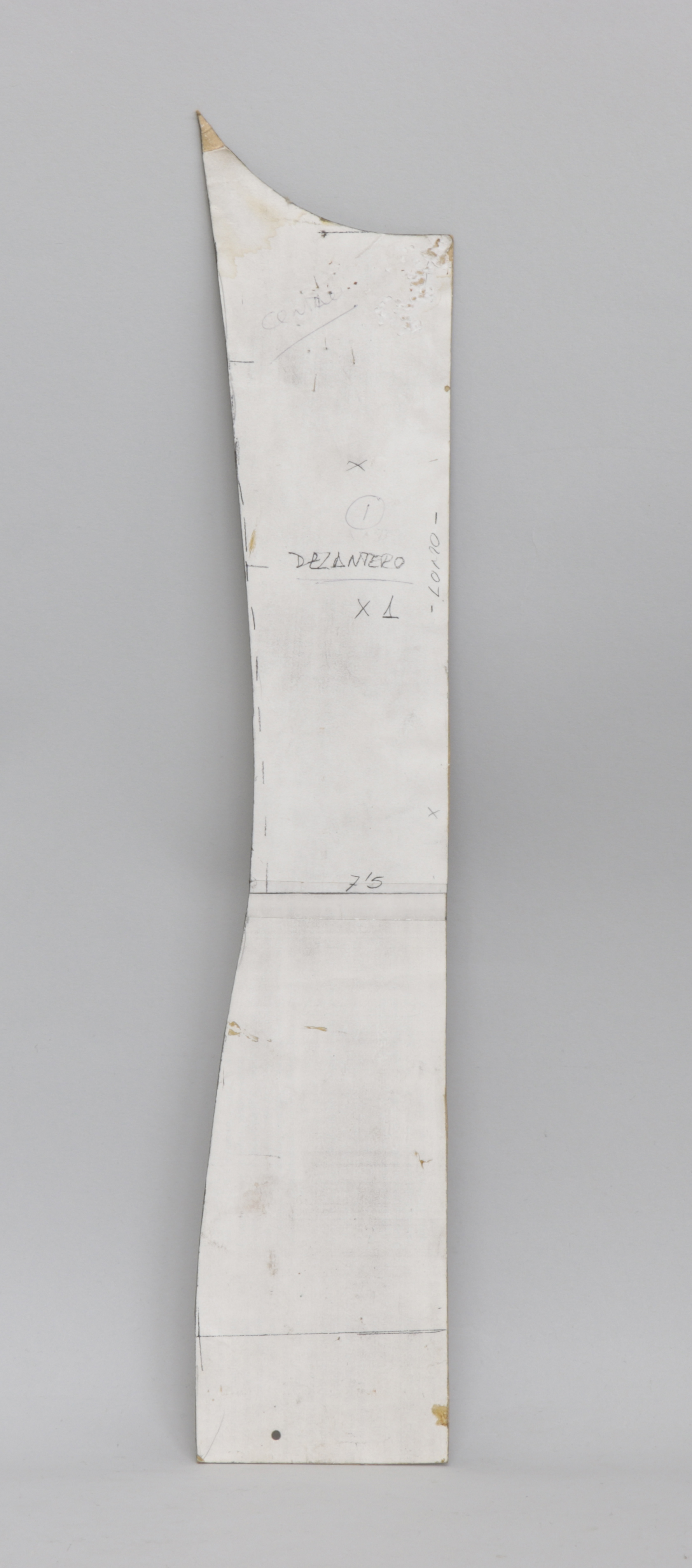 Está realizado en papel (es una fotocopia probablemente del original) pegado sobre una cartón y recortado. Los cuatro patrones que forman el vestido 4 están unidos por un hilo bramante.