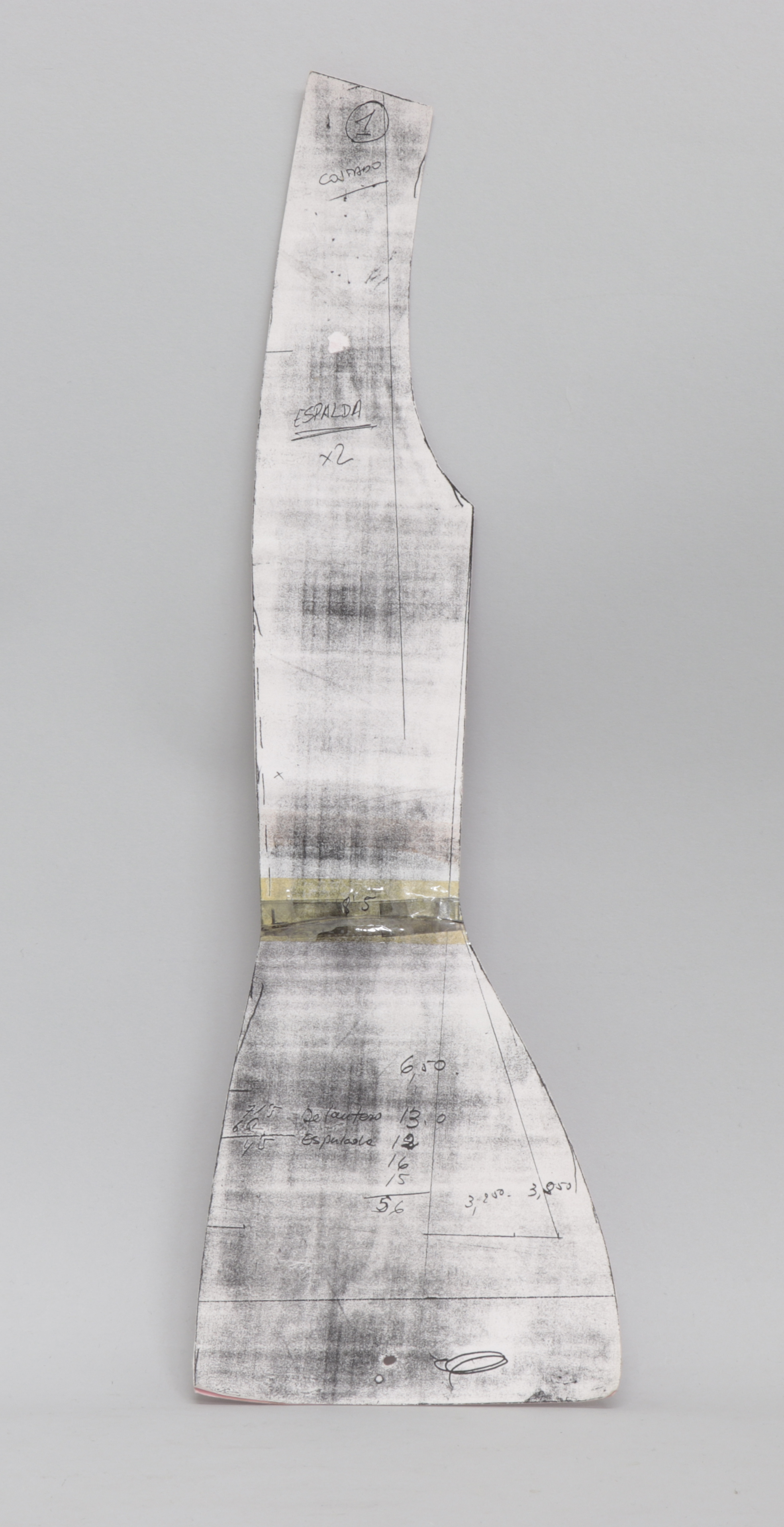 Está realizado en papel (es una fotocopia probablemente del original) pegado sobre una cartulina y recortado. Los cuatro patrones que forman el vestido 4 están unidos por un hilo bramante.