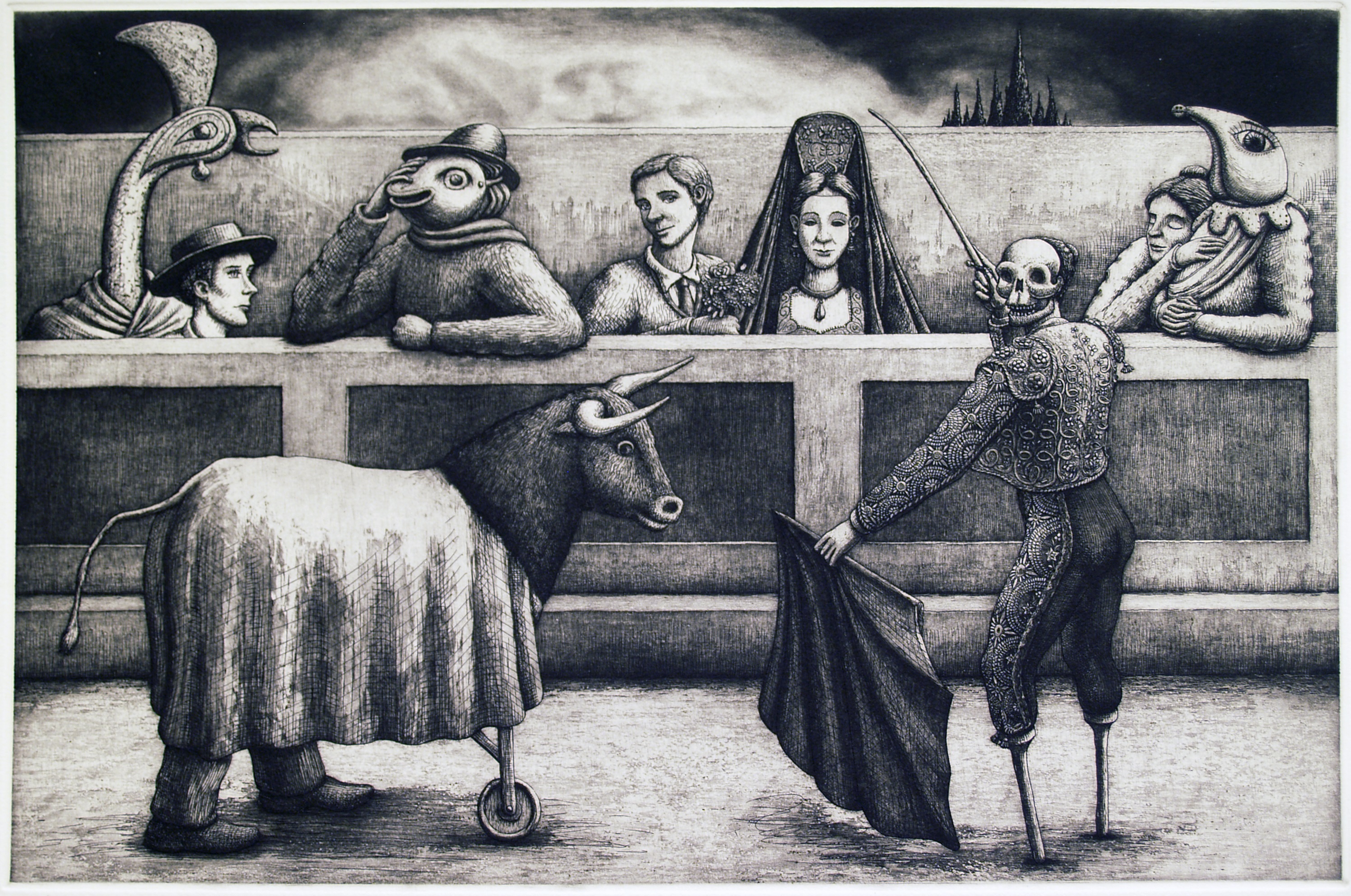 Una serie de cinco personajes asisten a una escena de falsa tauromaquia donde el toro es, en apariencia, una persona de quien se ven los pies en el lugar de las extremidades traseras del y, en la parte delantera, una pequeña rueda sobre la que parece reposar la estructura que cubre el faldón del cuerpo del animal. Frente a éste, el torero tiene por pies dos piezas de madera que parten desde la rodilla y terminan en pequeñas bases. El traje de luces se ajusta al cuerpo y el rostro está cubierto por una máscara que simula una calavera. Este personaje alza la mano derecha y amenaza con la espada, convertida en la única línea ligeramente diagonal de la escena.
