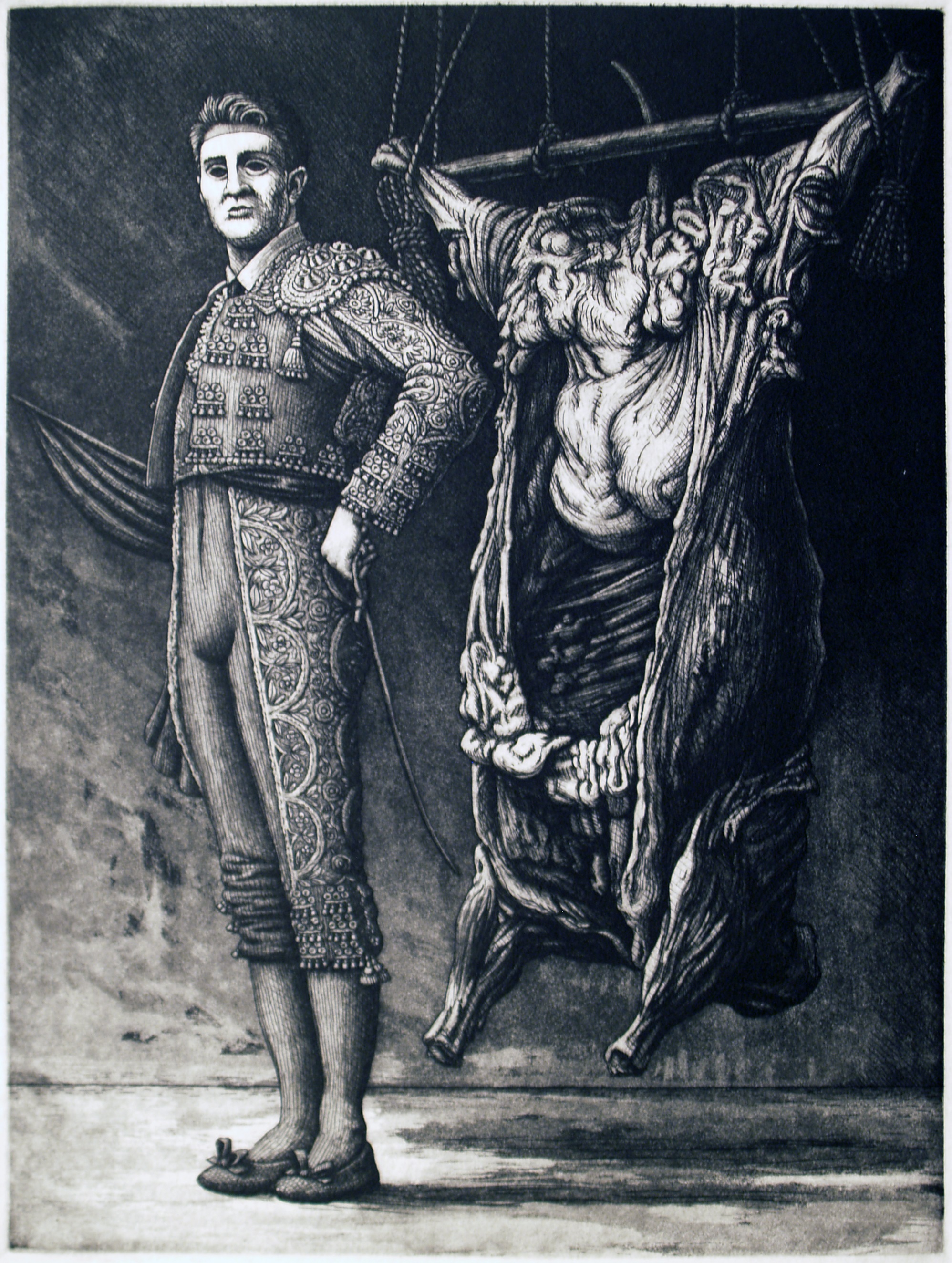 Inquietante escena grabada sobre plancha en formato vertical. Un hombre en pie, colocado de medio perfil y portando capote y muleta en la derecha y la espada en la mano izquierda, que se apoya sobre su cadera, viste traje de luces de torero y cubre su rostro con una máscara. A su espalda, el cuerpo de un toro pende de las extremidades traseras abierto en canal, degollado y dejando ver sus órganos internos.