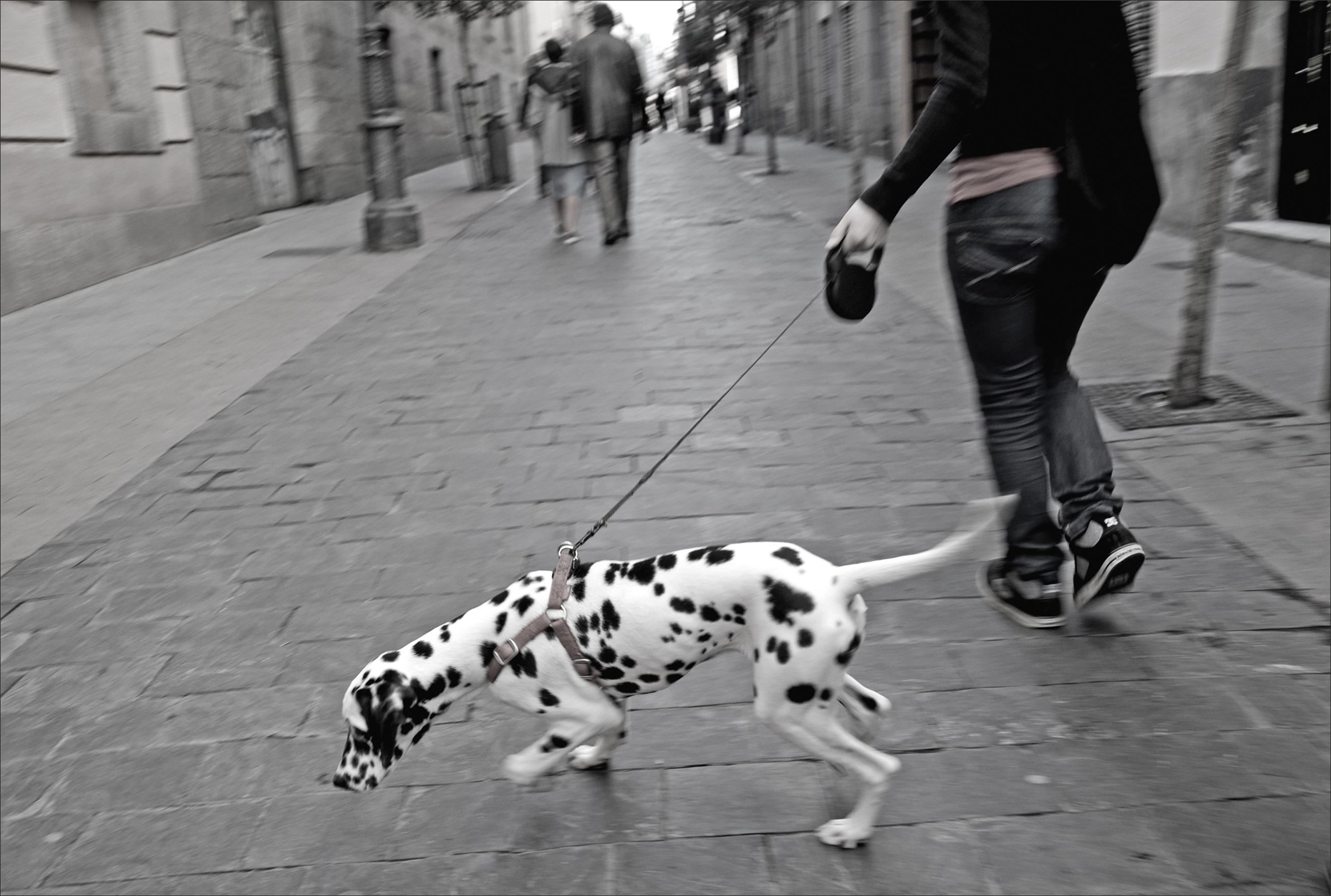 Fotografía en blanco y negro compuesta en formato horizontal. El título de la obra se plasma en el movimiento de la misma, donde un dálmata camina por una calle peatonal sujeto por un arnés y una correa a la mano de su dueña. Ésta aparece de espaldas en actitud de avanzar mientras intuimos que se gira a mirar al animal.