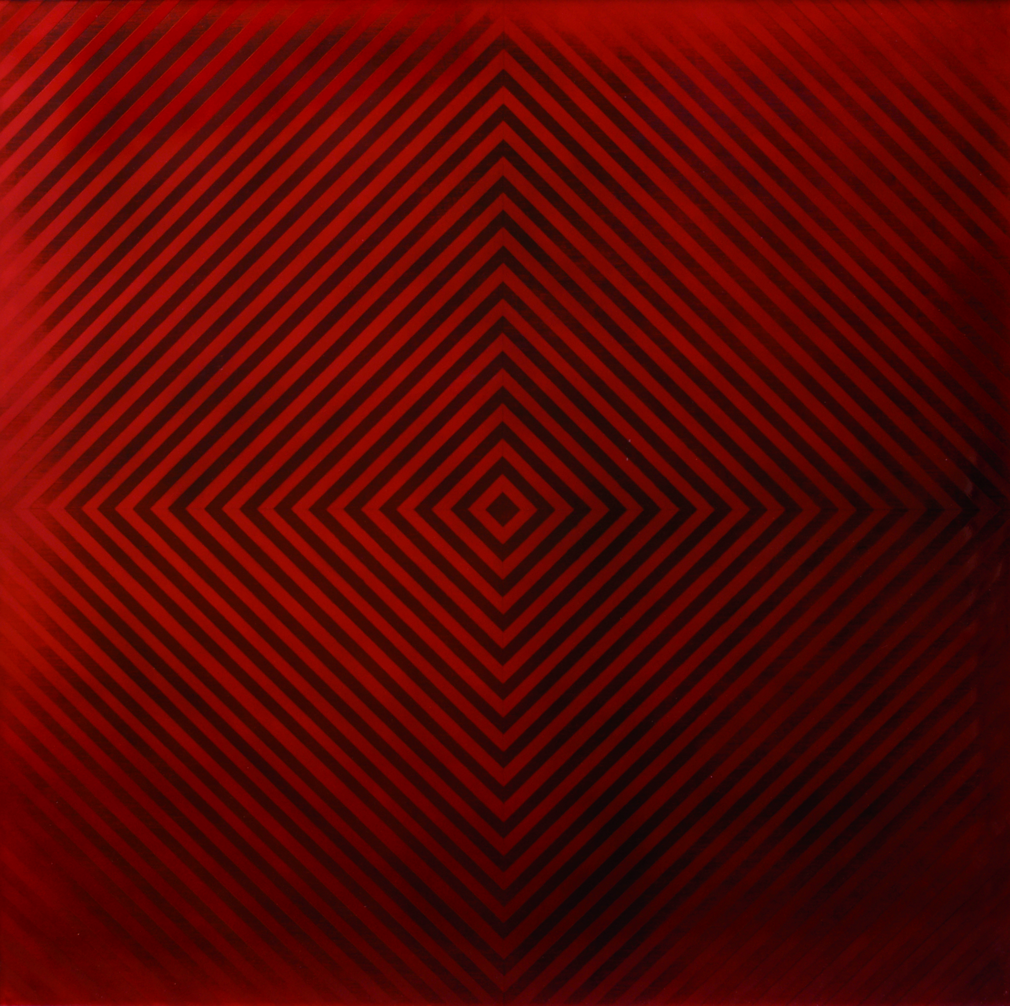Cuadrado rojo con líneas negras que dibujan una serie de rombos superpuestos en tamaño decreciente hacia el centro, desdibujándose en los perfiles exteriores para generar una atmósfera en la que las formas parecen flotar o diluirse.