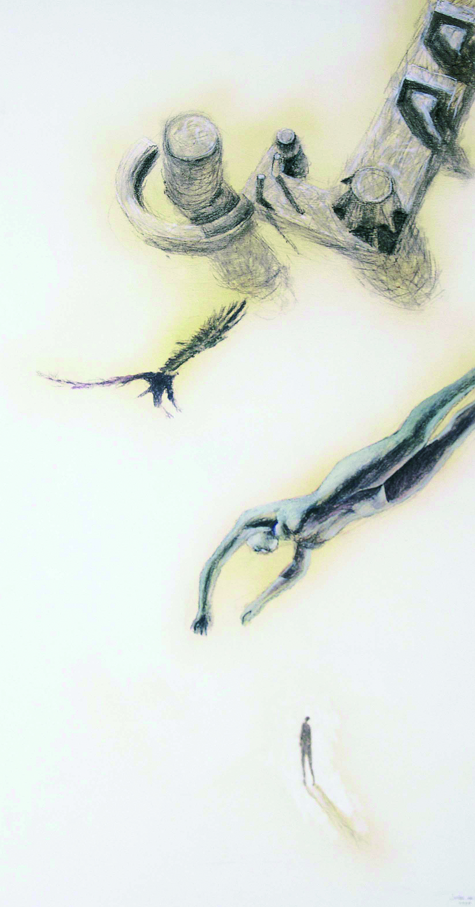 Composición de formas que parte de la silueta de una figura humana indefinida, a una escala minúscula, ubicada en el área inferior del formato y sobre la que se suceden las imágenes de una mujer en actitud de lanzarse de cabeza desde un trampolín y un ave rapaz de gran tamaño en vuelo, con las alas desplegadas, marcando una interesante superposición de diagonales.