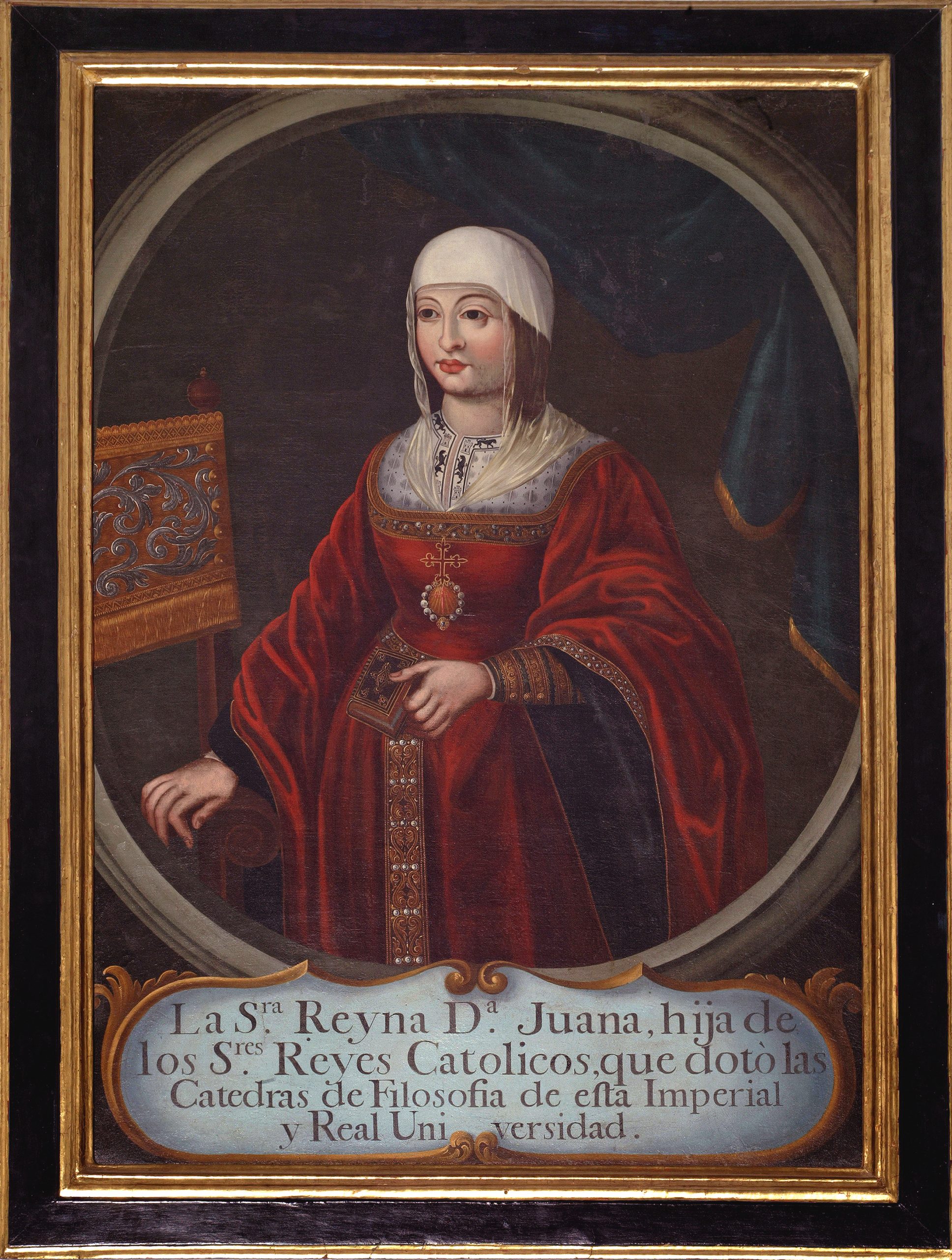 La figura se recorta sobre un fondo neutro en el que únicamente se advierte el detalle de un cortinaje azul con bordes dorados, enmarcada en el centro de un óvalo bajo el que encontramos una cartela en la que puede leerse: “La Sra. Reyna Dª Juana, hija de / los Sres. Reyes Católicos, que dotó las / Catedras de Filosofia de esta Imperial / y Real Universidad» (sic). La leyenda hace alusión al mandato de la Reina para que el gobierno de Granada atribuyera una renta fija a la Universidad para el mantenimiento de la Cátedra de Artes a través de la Cédula de 11 de abril de 1562.