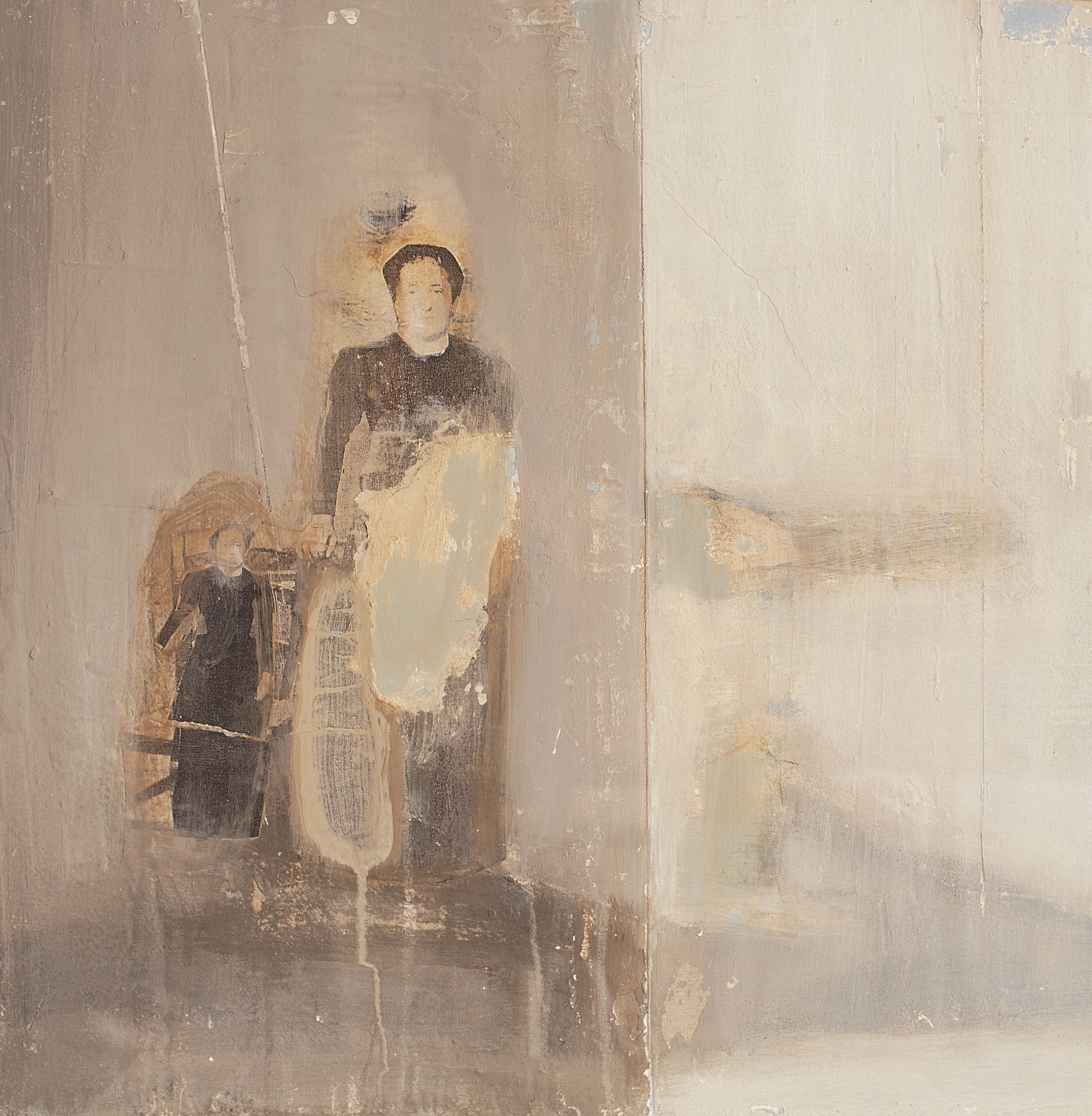 En el centro de esta pieza, una mujer vestida de negro se muestra junto un personaje infantil, también ataviado con largas vestiduras negras. La presencia, de marcada frontalidad, sumada al hieratismo de ambas figuras, refuerza las sensaciones transmitidas por el conjunto.