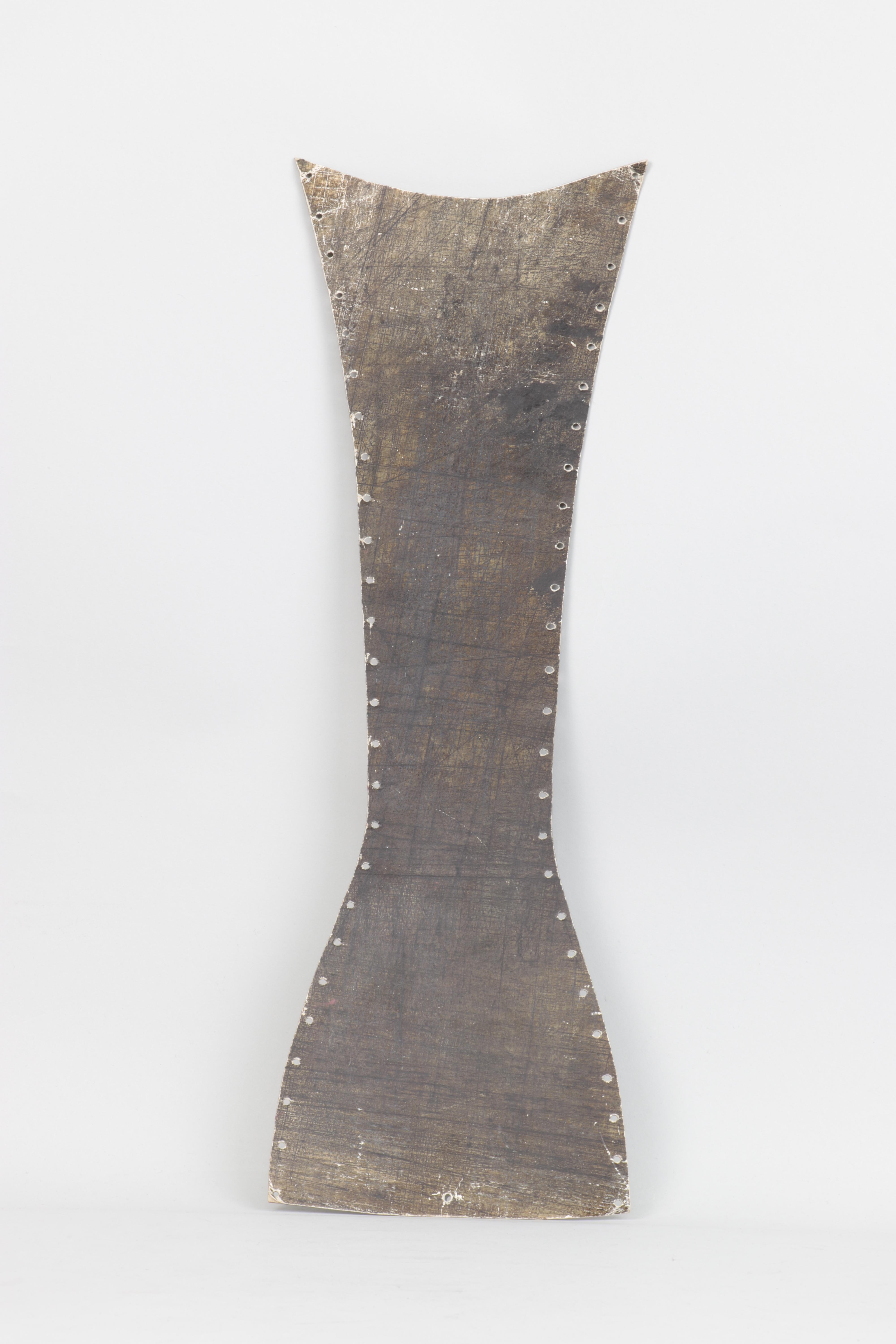 Está realizado en cartón y coloreado con tinta sepia y negra, presenta pequeños agujeros, probablemente realizados para unir las distintas partes con hilo y formar el corpiño.