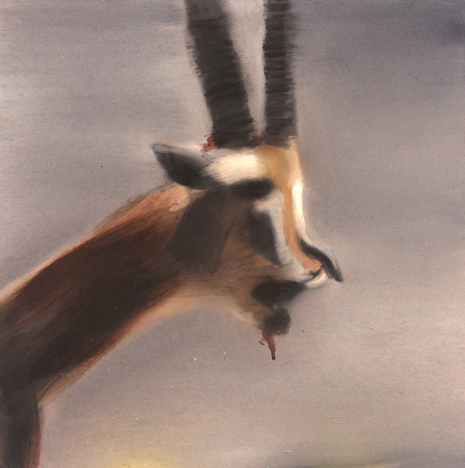 La cabeza y el cuello de la gacela de Thomson entran en la escena a través del lateral izquierdo, dando muestras de su herida a través de la sangre que brota del hocico del animal. La paleta cromática reproduce la realidad a la hora de recrear el pelaje en tonos pardos y blancos, mientras que también se utiliza como un recurso para acentuar el dramatismo de la escena mediante la inclusión de un fondo gris de tintes violáceos.