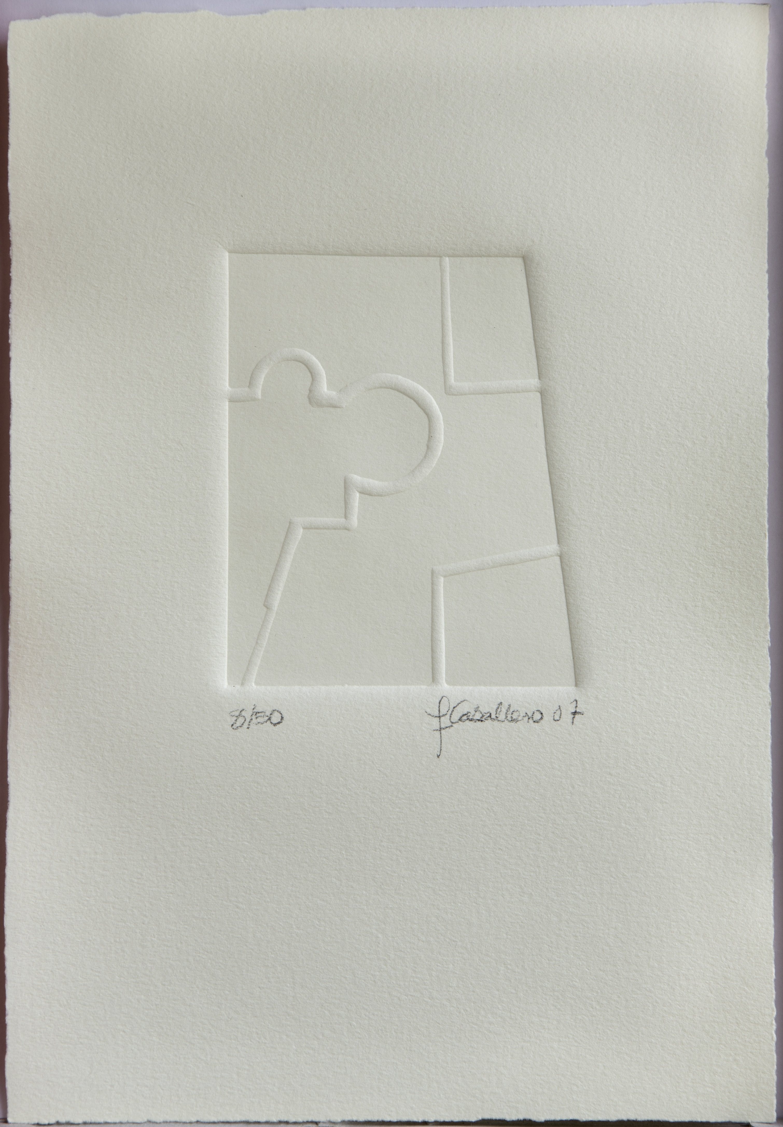 Estampa gofrada en formato vertical en cuyo interior se marca el relieve de un conjunto de geometrías inscritas en una estructura cuadrangular. El artista juega con el volumen saliente del papel y con las líneas trazadas en su interior, desarrollando conceptualmente el tema de la búsqueda del límite.