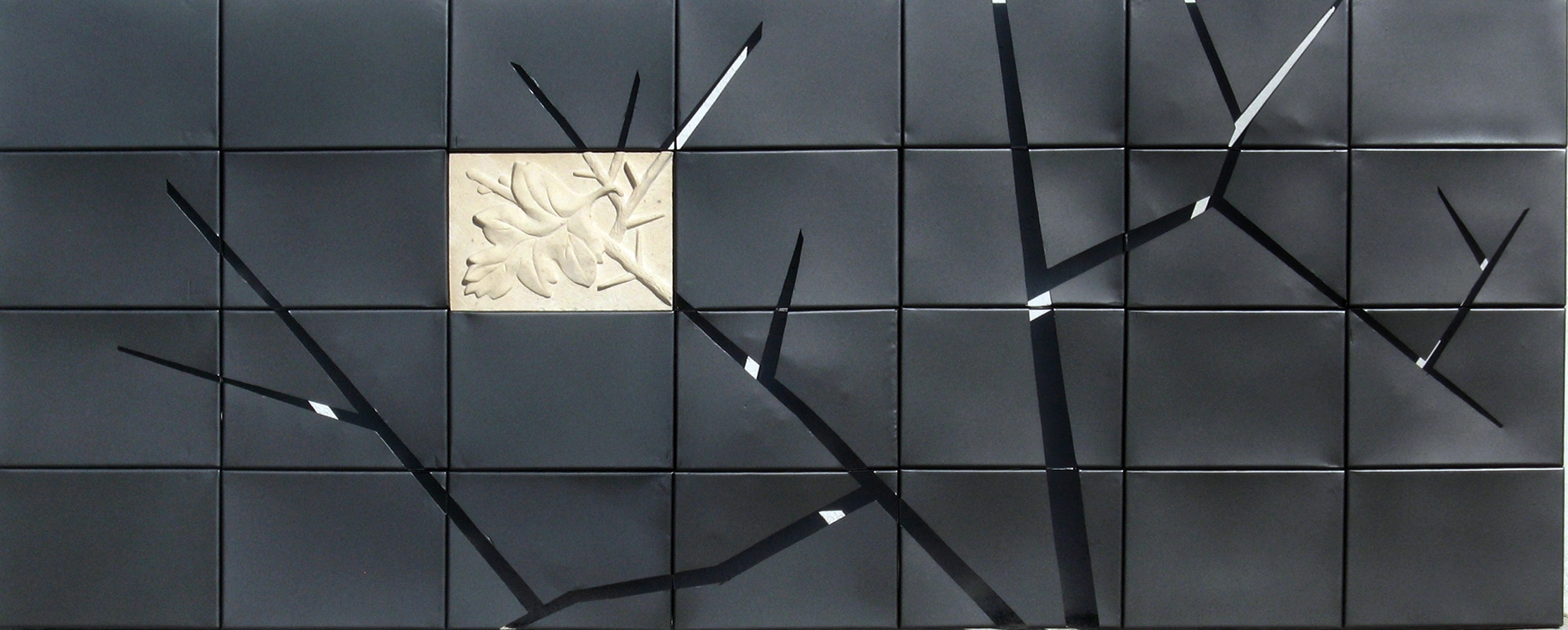 Pieza de gran formato formada por secciones de rectangulares de metal negro y una de piedra caliza, caracterizadas las primeras por ser lisas o contar con incisiones de líneas diagonales que, continuadas y conectadas entre sí, generan la imagen de un entramado de ramas en hueco a través de los que se puede observar la trasera de la obra, mientras que la pieza de piedra caliza presenta un bajorrelieve vegetal conectado a las ramificaciones anteriormente mencionadas.