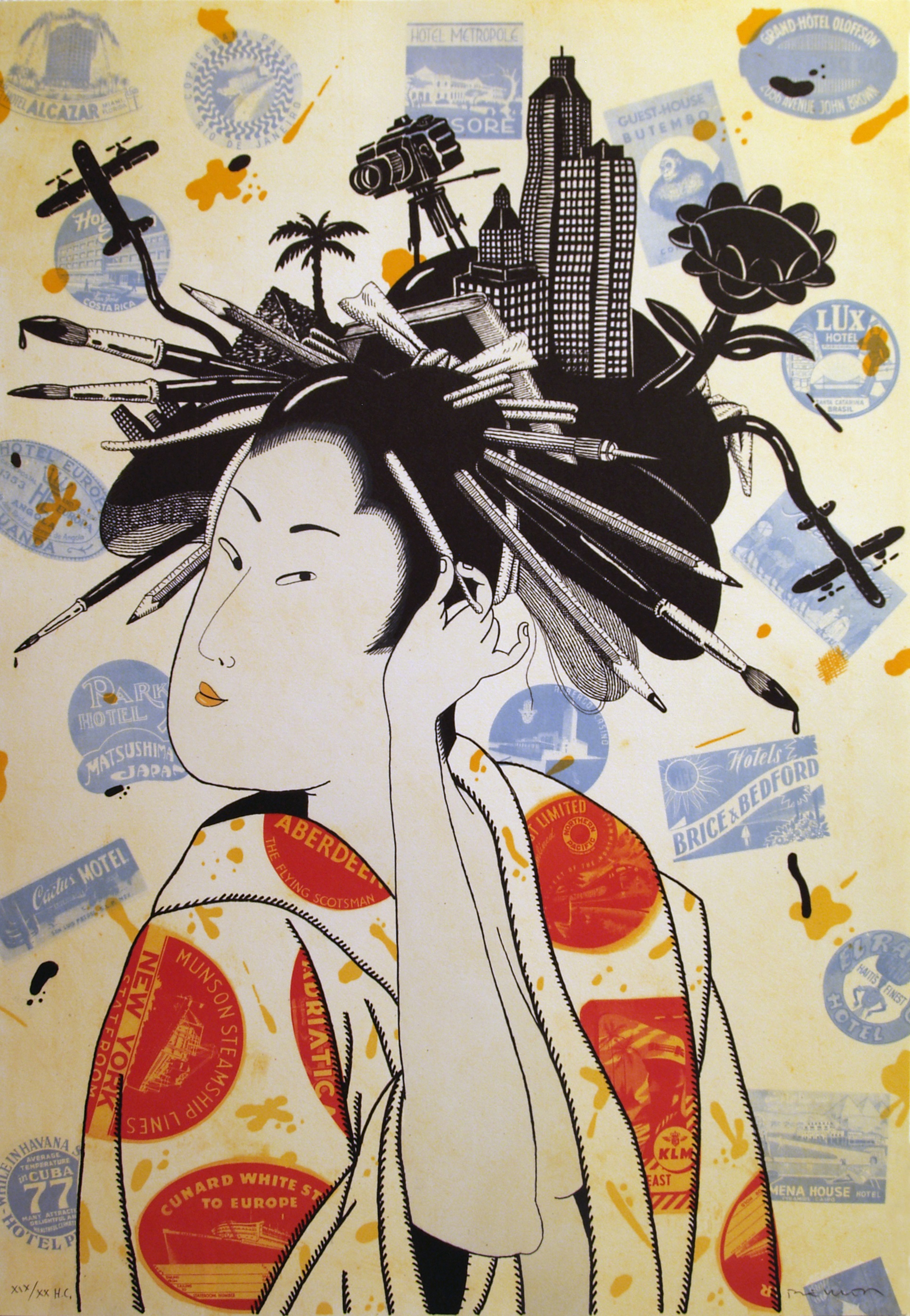 Retrato de busto prolongado de una geisha que se muestra de frente, girando la cabeza en medio perfil mientras se coloca en el cabello, recogido de forma tradicional en un moño alto, una serie de pinceles y lápices. En su cabeza reposan un rascacielos, una cámara fotográfica con sobre un trípode, una palmera y una flor, y de ella parecen partir aviones.