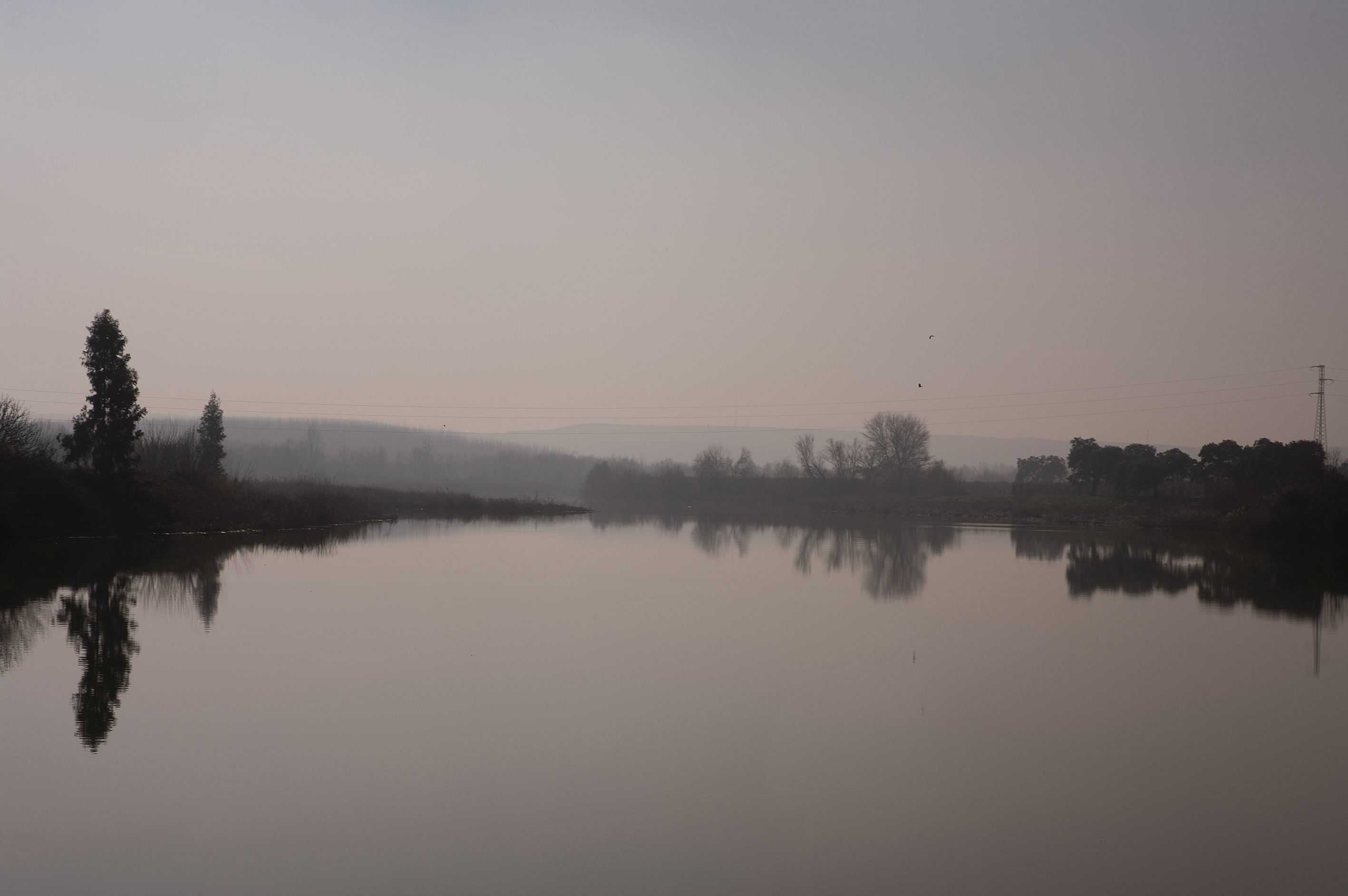 Fotografía de paisaje que, dada la escasez de luz, revela una amplia gama de grises y azules grisáceos. La composición es simétrica en la horizontal, mostrando un reflejo a partir de la presencia de un estancamiento de agua.