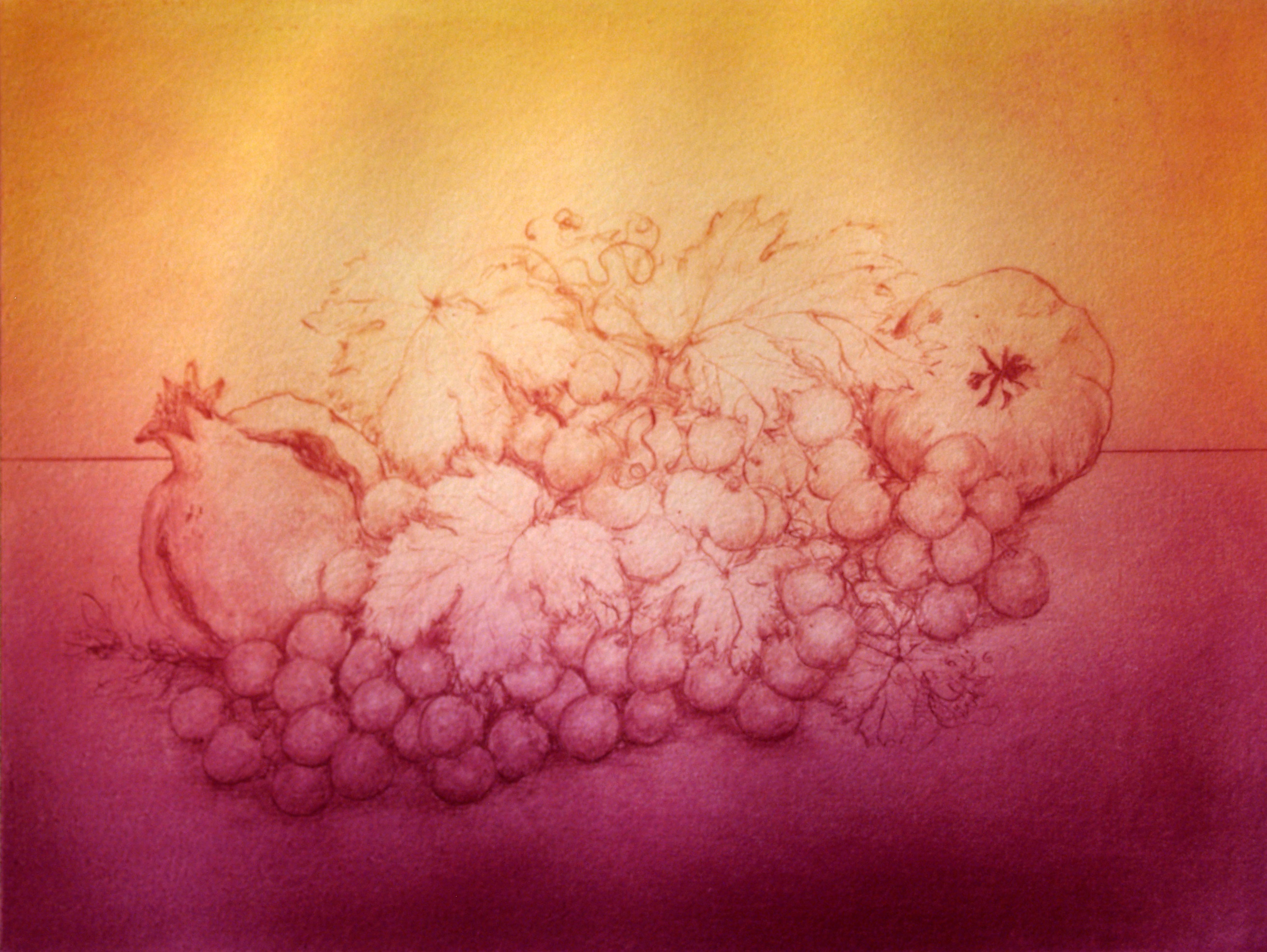 Grabado al aguafuerte en cuyo centro se representa un bodegón de frutas donde destacan uvas y granadas y, tras ellos, una intencionada línea recta que divide el soporte en dos y acentúa la transición cromática desde el ocre amarillento protagonista de la mitad superior hasta el rojo violáceo de la mitad inferior.