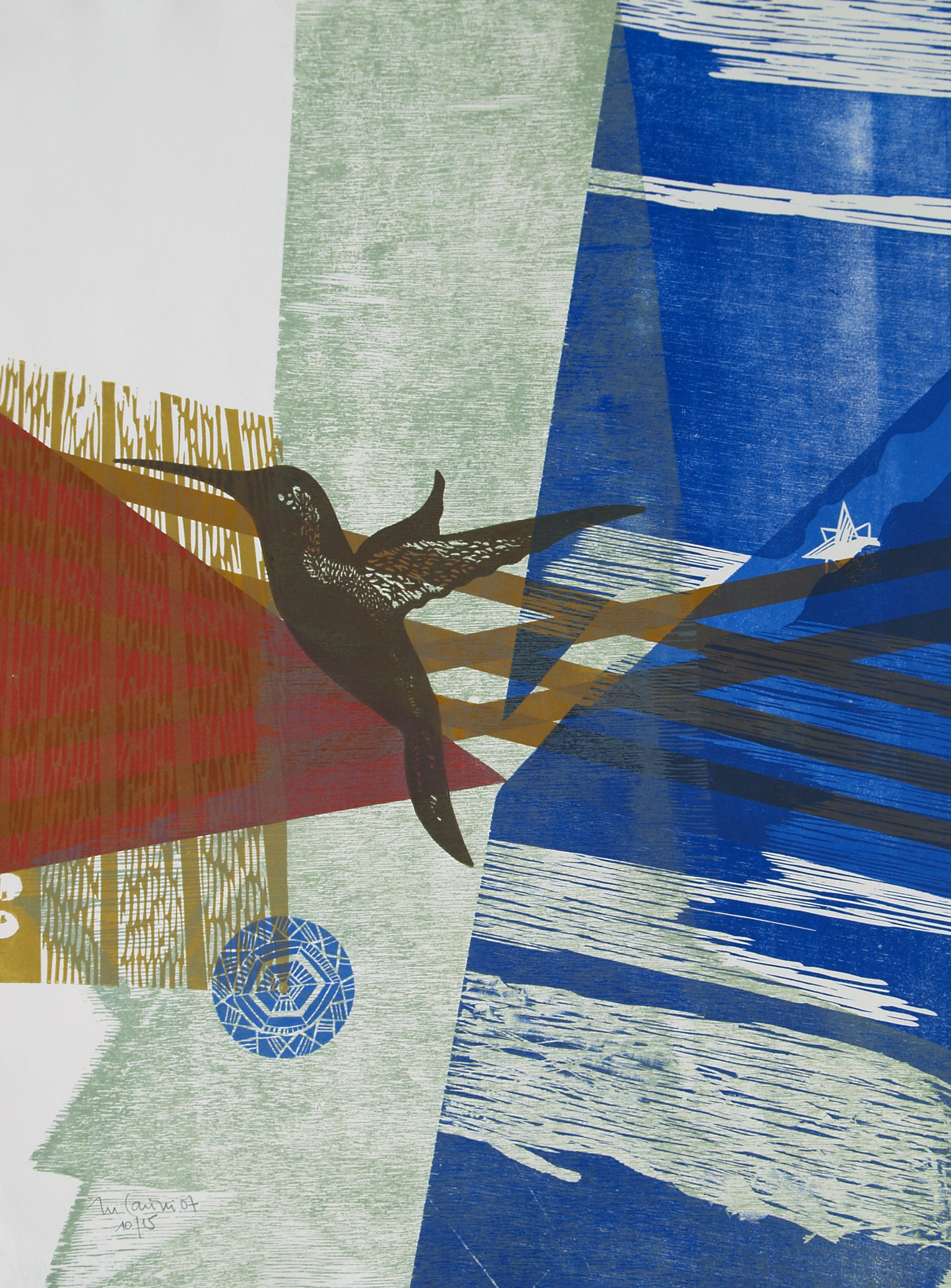 La pieza que nos ocupa es una buena muestra de las cualidades que acabamos de mencionar. La esbelta y delicada silueta de un colibrí en vuelo se recorta sobre un conjunto de planos de color dotados de las texturas de la madera. El tono marrón que imprime el cuerpo del ave contrasta con los azules, verdes, rojos, blancos y ocres que configuran el fondo y se adorna de un minucioso calado en las alas y la región superficial de la cabeza y el cuerpo, hasta la cola, reproduciendo el brillo de las plumas del animal.
