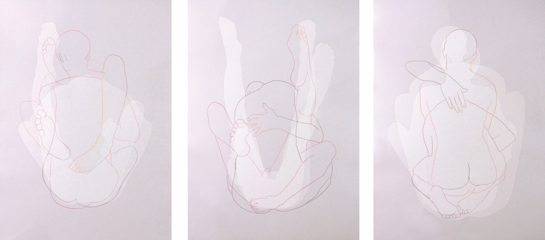 Tríptico compuesto por tres estampas de papel sobre las que la artista dibuja las siluetas de una pareja de amantes en diferentes posiciones eróticas.