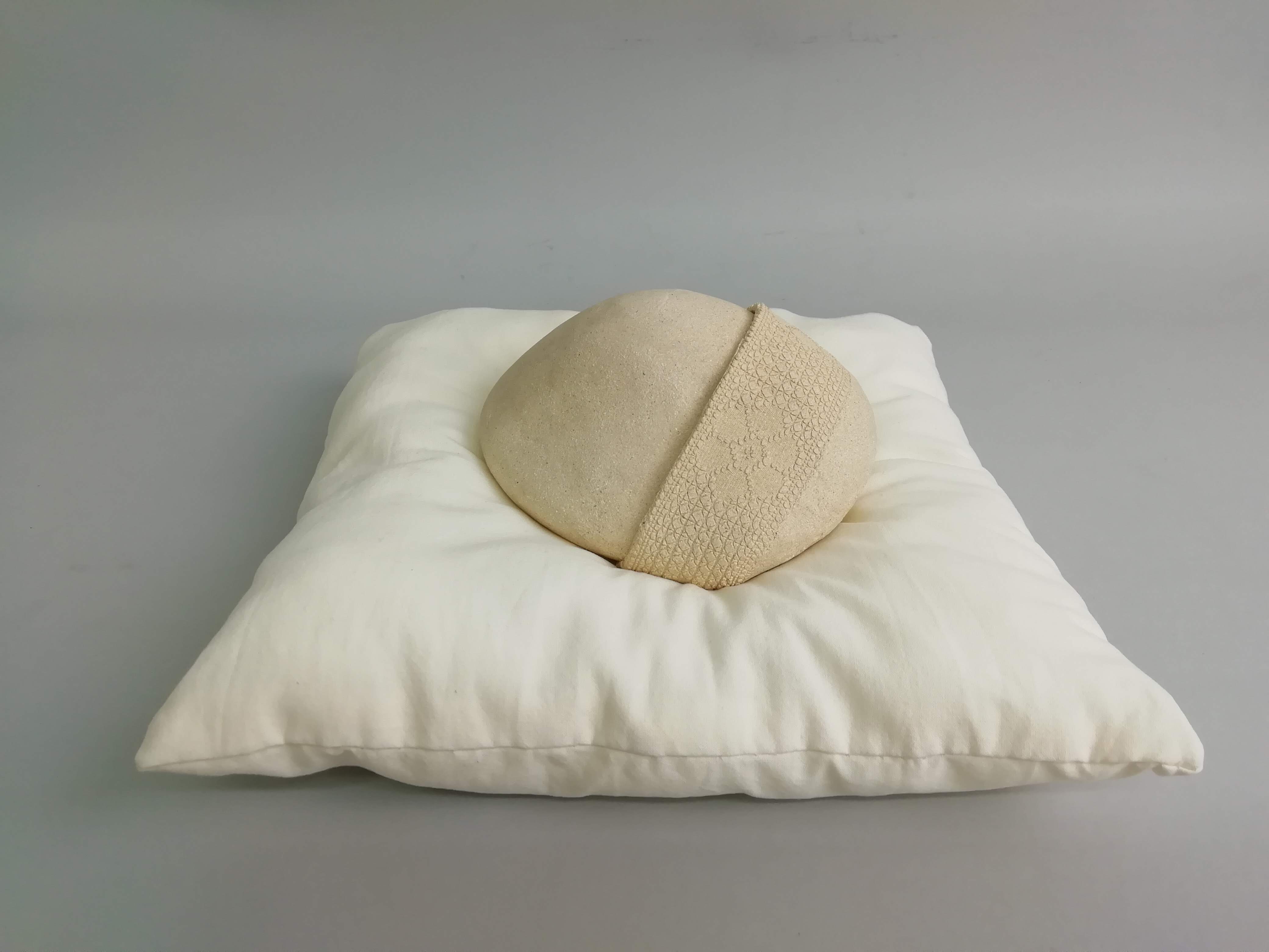 En Amantes #19 las líneas curvas de la cerámica contrastan con la textura del material y su dureza. Asimismo, el trabajo de recreación de una superficie textil bordada imprime calidez y suavidad a la pieza, cuya contextualización se refuerza al colocarla sobre una almohada blanca.