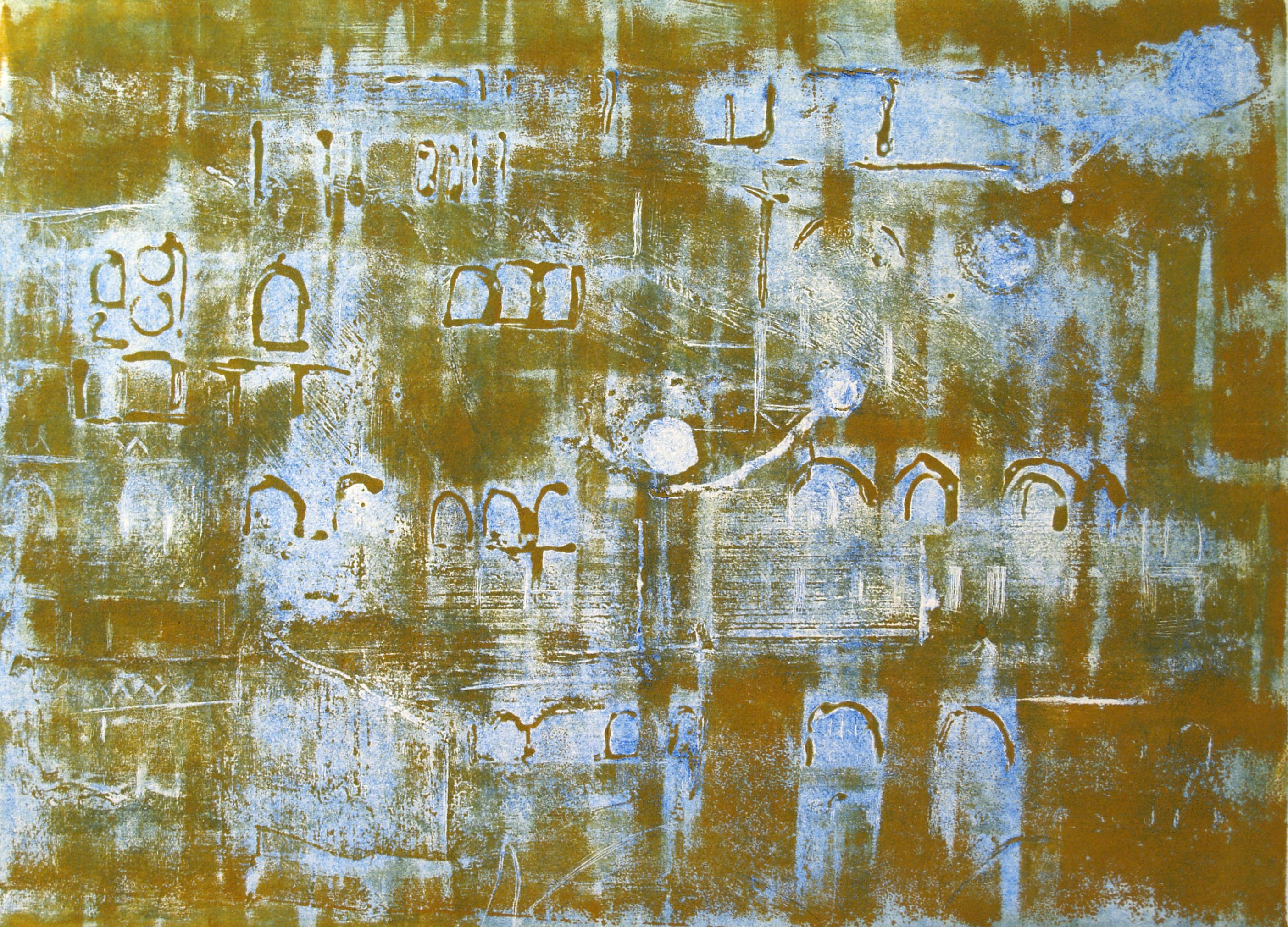 Estampa abstracta que evoca la vista de una ciudad a través de la presencia de arcos distribuidos sobre un fondo compuesto a partir de manchas de un blanco azulado y un tono ocre, superpuestas en la plancha y realizadas poniendo especial énfasis en su textura.
