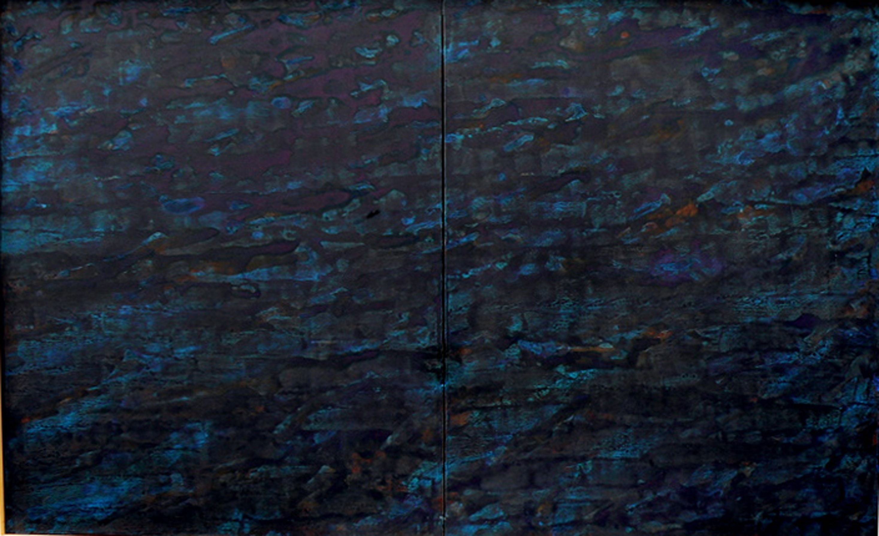 Dos soportes cuadrangulares unidos forman el «Díptico del amor oscuro», compuesto por el artista a partir de un juego de pinceladas amplias y libres en azules de diferente intensidad y brillo que, aplicadas acentuando la horizontalidad, aportan gran riqueza expresiva a la obra.