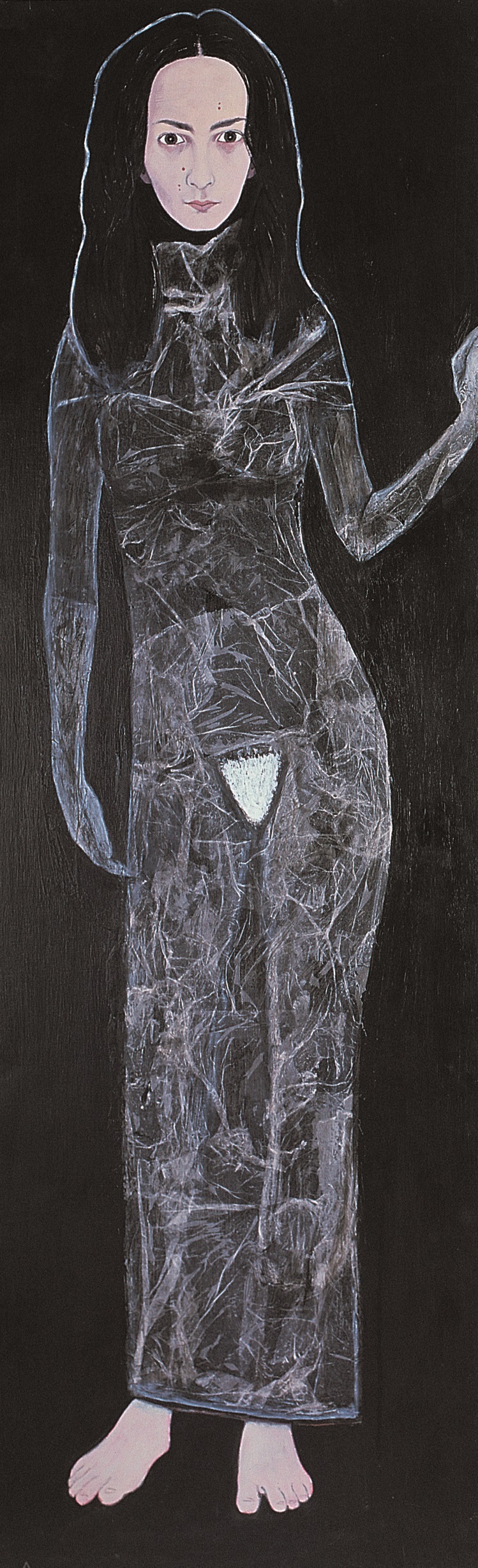Recortada sobre fondo negro, la imagen de una mujer se presenta frontalmente, , recortada sobre fondo negro a partir de un interesante juego de líneas blancas que delimitan su cuerpo.