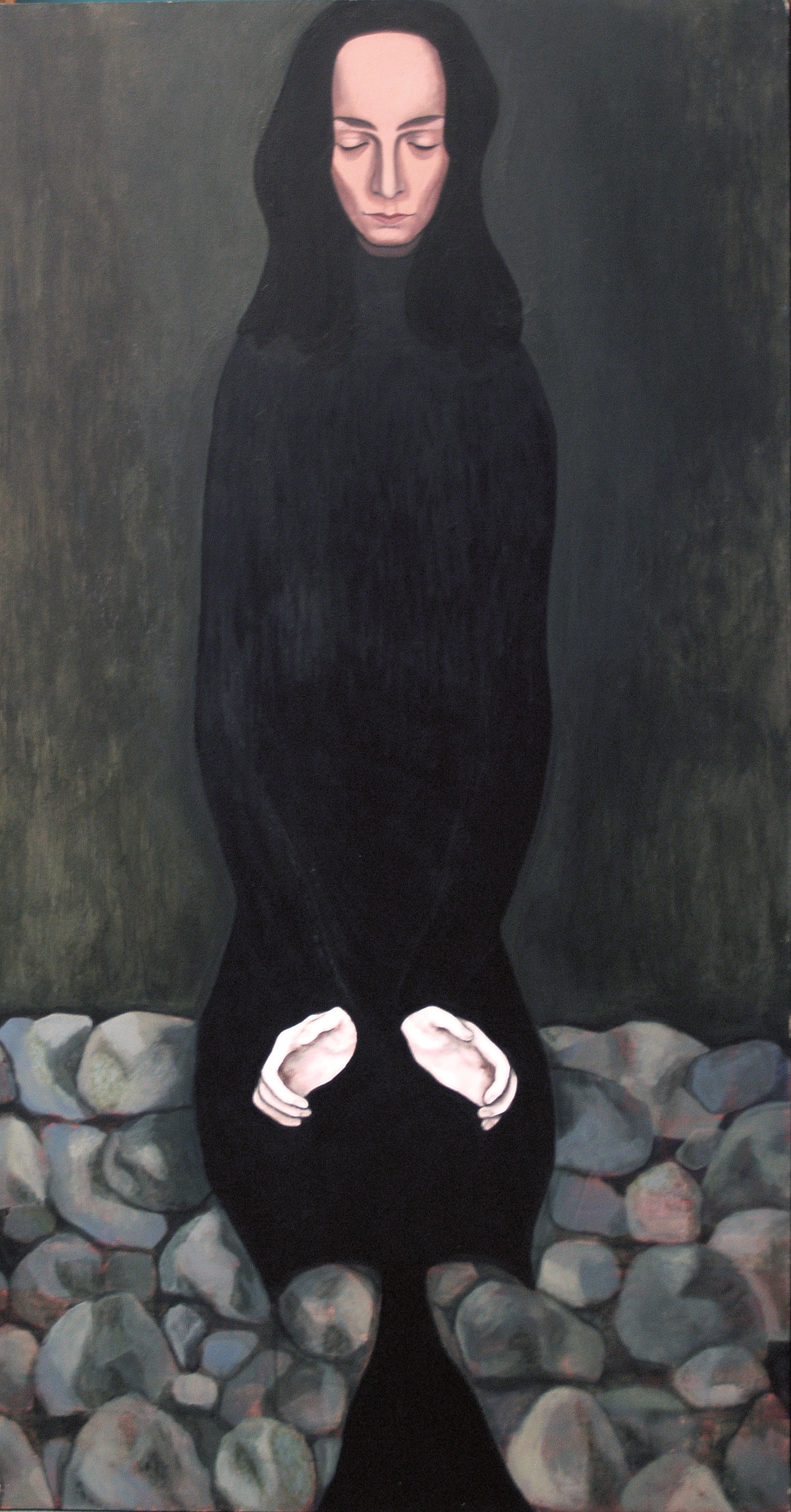El tercio inferior de la escena está protagonizado por una base de rocas en tonos grises, en cuyo centro se abre paso una forma cónica a través de la que se derrama el negro del vestido.