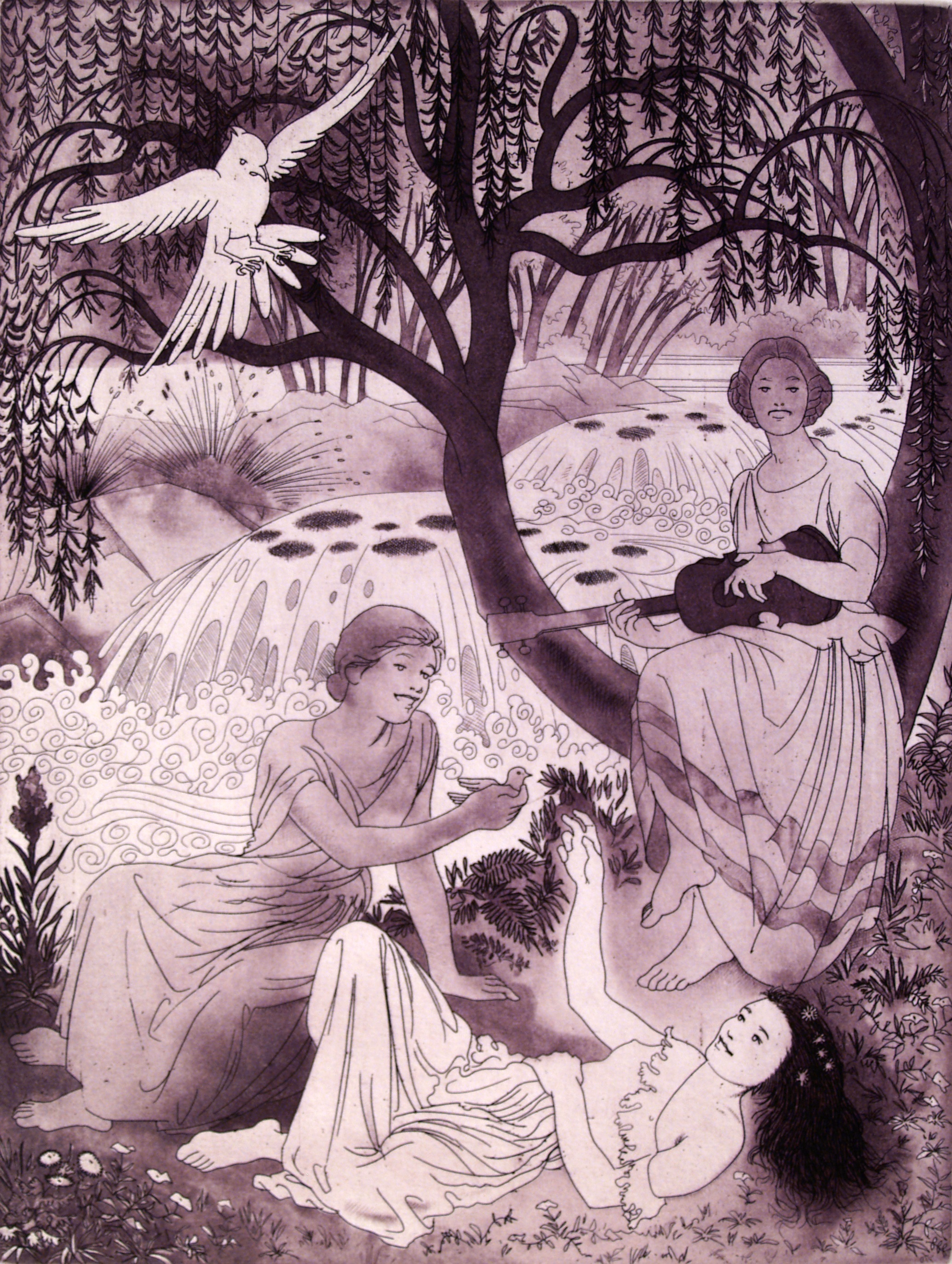 Paisaje con figuras femeninas, compuesto a partir de líneas diagonales, en diferentes intensidades de negros de matiz violáceo sobre papel blanco, donde el dibujo es claro protagonista para recrear la bucólica escena protagonizada por tres mujeres jóvenes, bajo un árbol cuyo porte remite al sauce llorón.