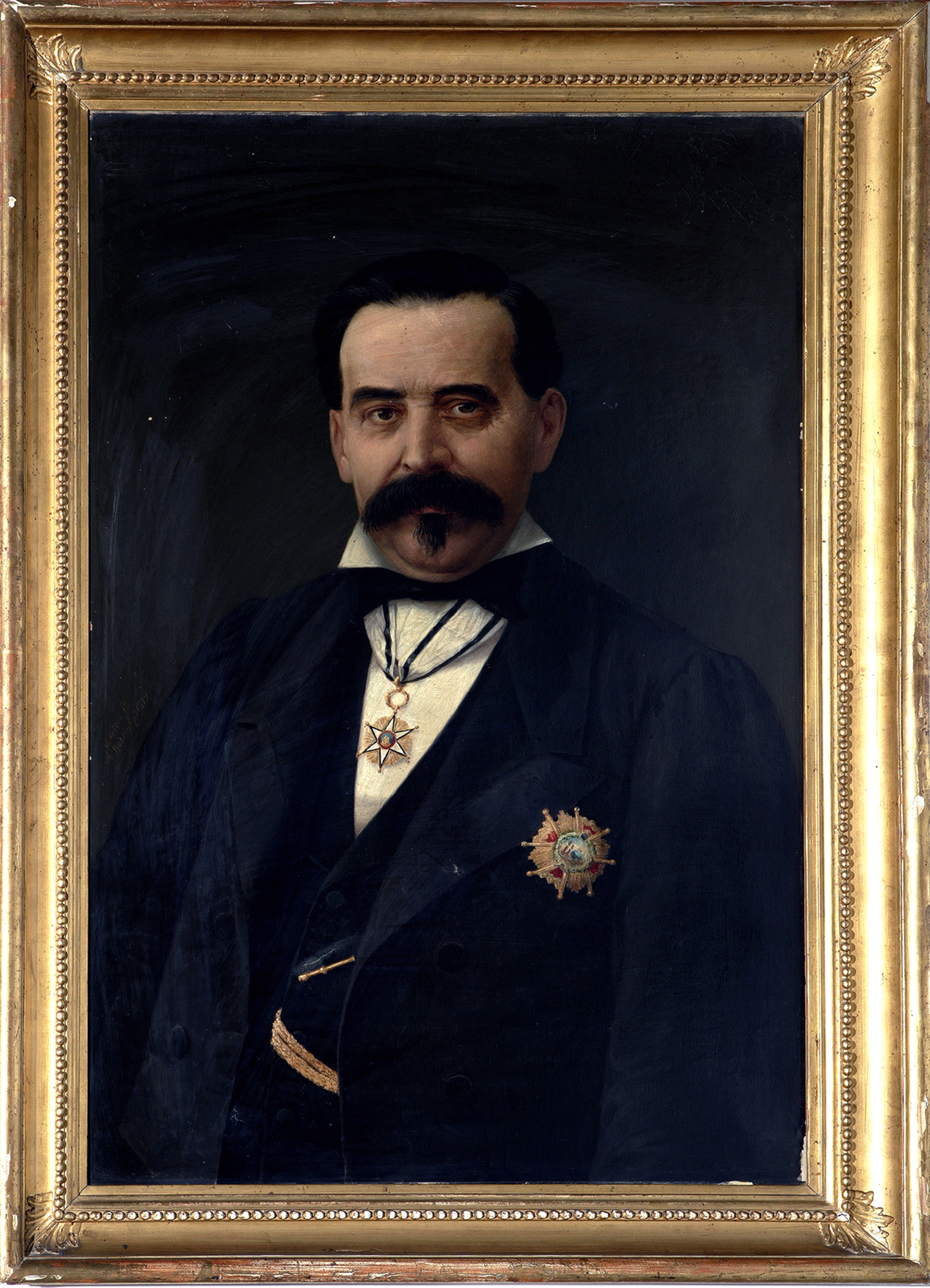 Retrato de medio cuerpo de un caballero con poblado bigote y perilla ante fondo neutro oscuro. Viste levita oscura sobre chaleco del mismo tono, dejando ver la camisa blanca y corbata de lazo anudada al cuello. Sobre el pecho luce la Gran Cruz de Isabel la Católica y otra condecoración no identificada pende de su cuello.